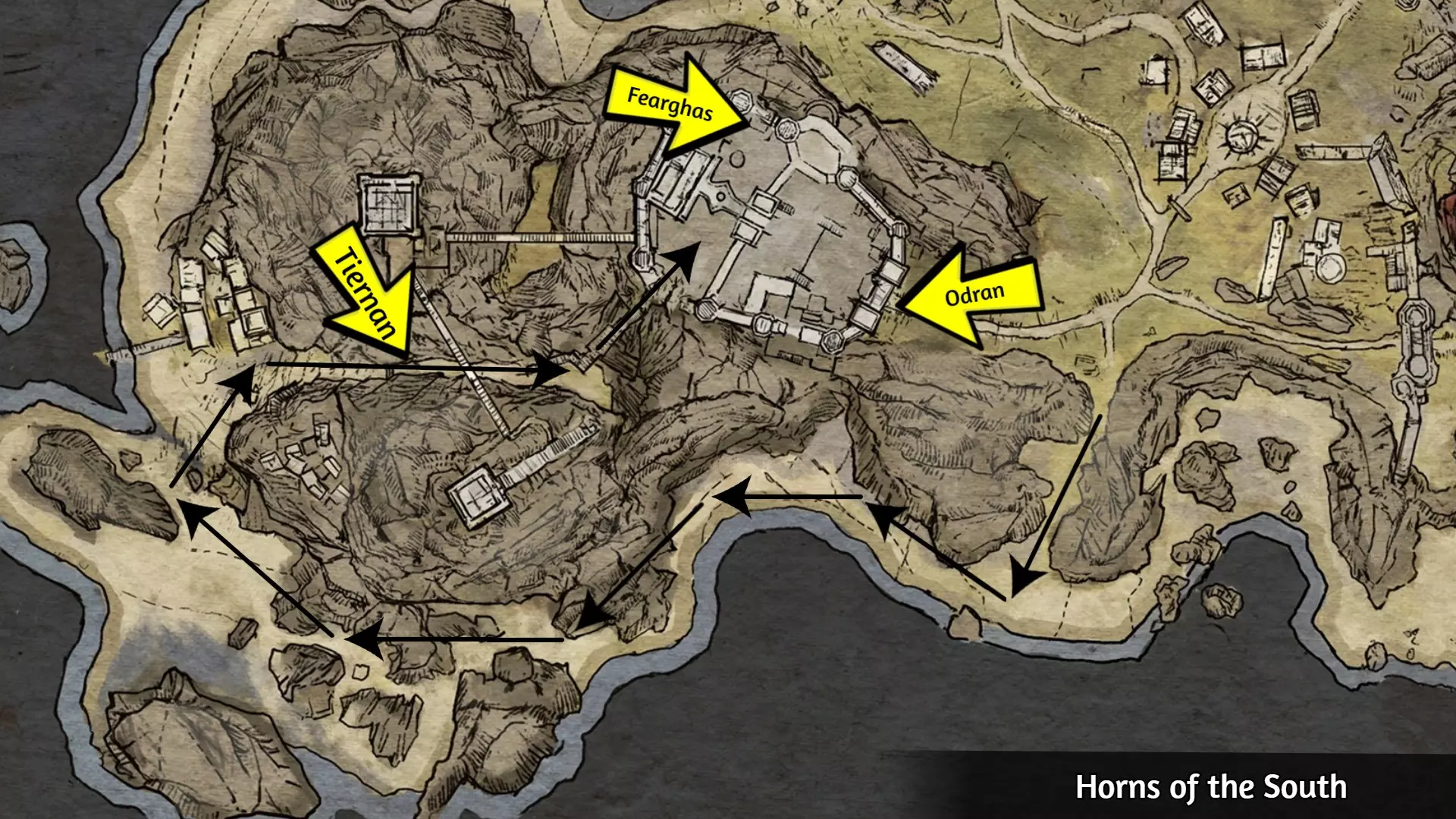在第一章的最开始,你的目标会是“卡拉多克给我的徽章应该能让我安全通过南门”。跟随任务标记会带你找到正门的奥德兰。与他对话会打开大门,并使“大门毫无必要”成就失效。相反,请按照以下步骤通过另一条路线进入城市。 步骤1:去大门之前,走下图所示的小路。 步骤2:沿途蒂尔南会主动与你对话。这里你的选择无关紧要。 步骤3:与费格斯交谈,成就就会解锁。