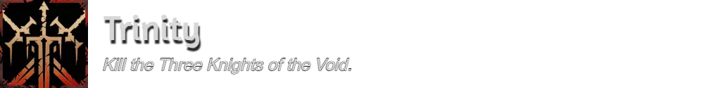 要解锁【Trinity】成就,你必须击败虚空骑士,这是三个小Boss,分别位于游戏的三个区域中。初次遇到时它们是不具敌意的。你可以与每个虚空骑士对话并请求决斗,或者直接攻击它们。具体位置可参考下方图片。