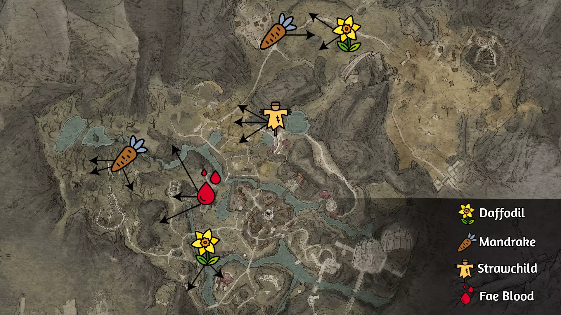 步骤1:创建手动存档,以防出现错误。 步骤2:收集以下物品,可参考下方图片获取准确位置。 ▸ 水仙花 x5 ▸ 曼德拉草 x3 ▸ 稻草孩子的头骨 x3 ▸ 精灵之血 x2 步骤3:返回埃尔文处,选择以下对话选项: ▸ 我已经拿到你要的所有东西了。 ▸ 离开