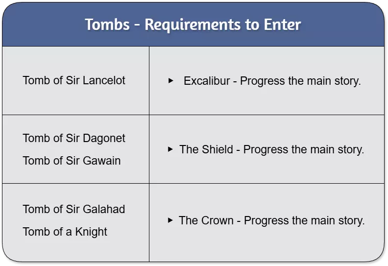 秘密区域:推进秘密区域的进度,与织者(The Weaver)对话直至所有选项耗尽,最终在第三个区域将其击败。 - 秘密区域1 - 秘密区域2 - 秘密区域3 坟墓:完成每个坟墓,确保离开时菲奥诺拉(Fionola)出现。若她未出现,则表示坟墓未正确完成。 - 兰斯洛特爵士之墓 - 达戈内特之墓 - 高文爵士之墓 - 加拉哈德爵士之墓 - 一位骑士之墓