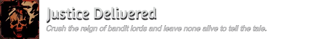 要解锁此成就,你必须首先宣誓成为守护者。有关如何成为守护者的详细信息,请参考【The Keeper of the South】成就。宣誓完成后,你的任务日志中会自动接取四个新任务。这些任务非常简单,需要在南之角区域的不同地点击杀一定数量的敌人。一旦击败所需数量的敌人,每个任务都会自动完成。完成第四个也是最后一个任务后,【Justice Delivered】成就将解锁。 所需任务: 恢复秩序:绞刑架 恢复秩序:小树林 恢复秩序:国王之路 恢复秩序:商人废墟 制作