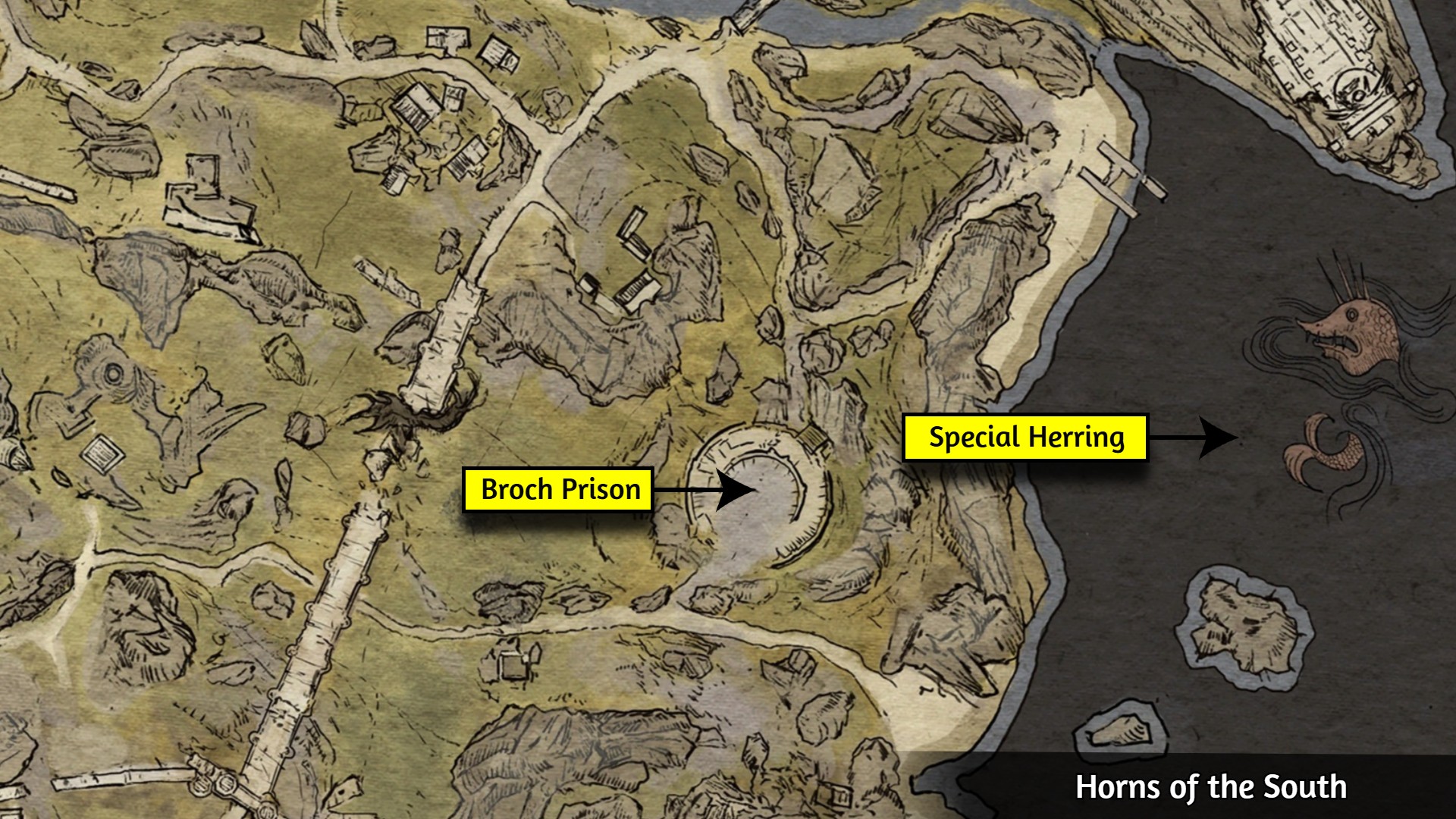 前置物品 鱼竿 - 可从奥拉思处购买 奶酪 - 可从厨房的鲁尔克处购买 步骤1 手动创建一个存档,以防出错。 步骤2 前往下图所示位置,钓获【特别的鲱鱼】。 步骤3 放置营火,使用奶酪和新钓获的【特别的鲱鱼】作为食材,烹饪【酸鲱鱼奶酪】。 步骤4 返回下图所示的 broch监狱找伦波尔特,选择以下对话选项: ▸ 闻到什么了? ▸ 离开 步骤5 装备【伦波尔特的复仇】并对伦波尔特使用,以解锁成就。