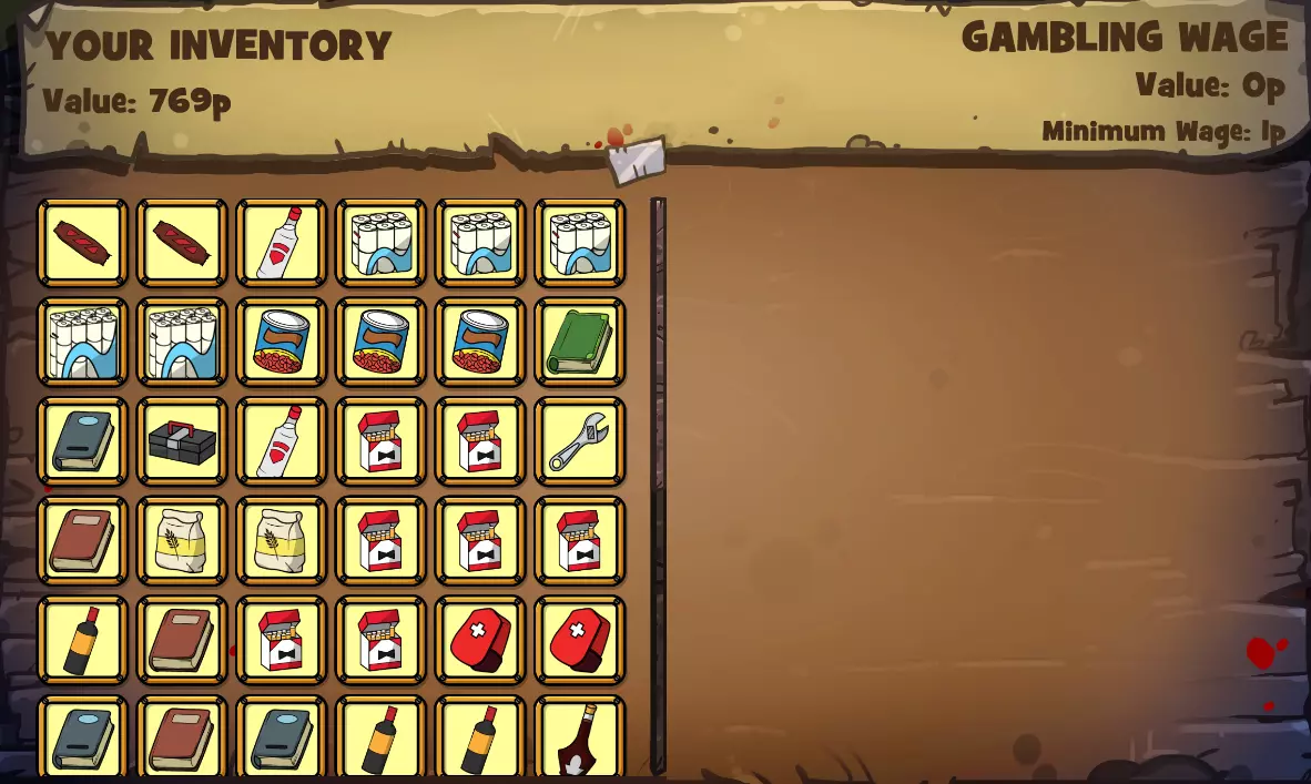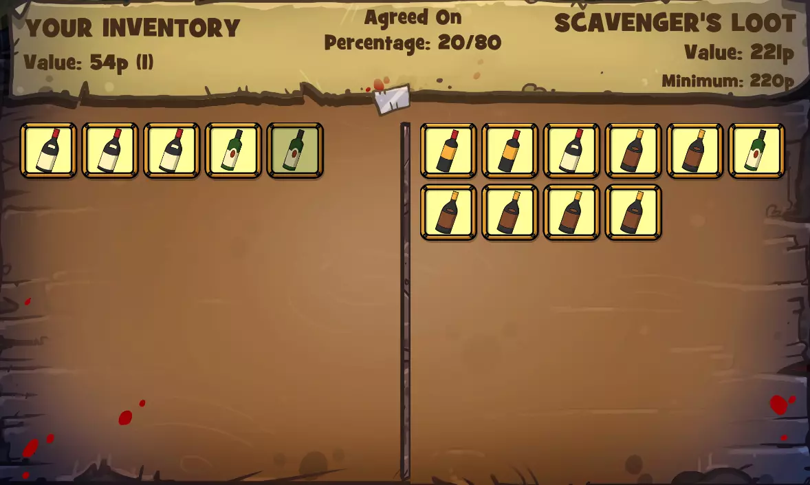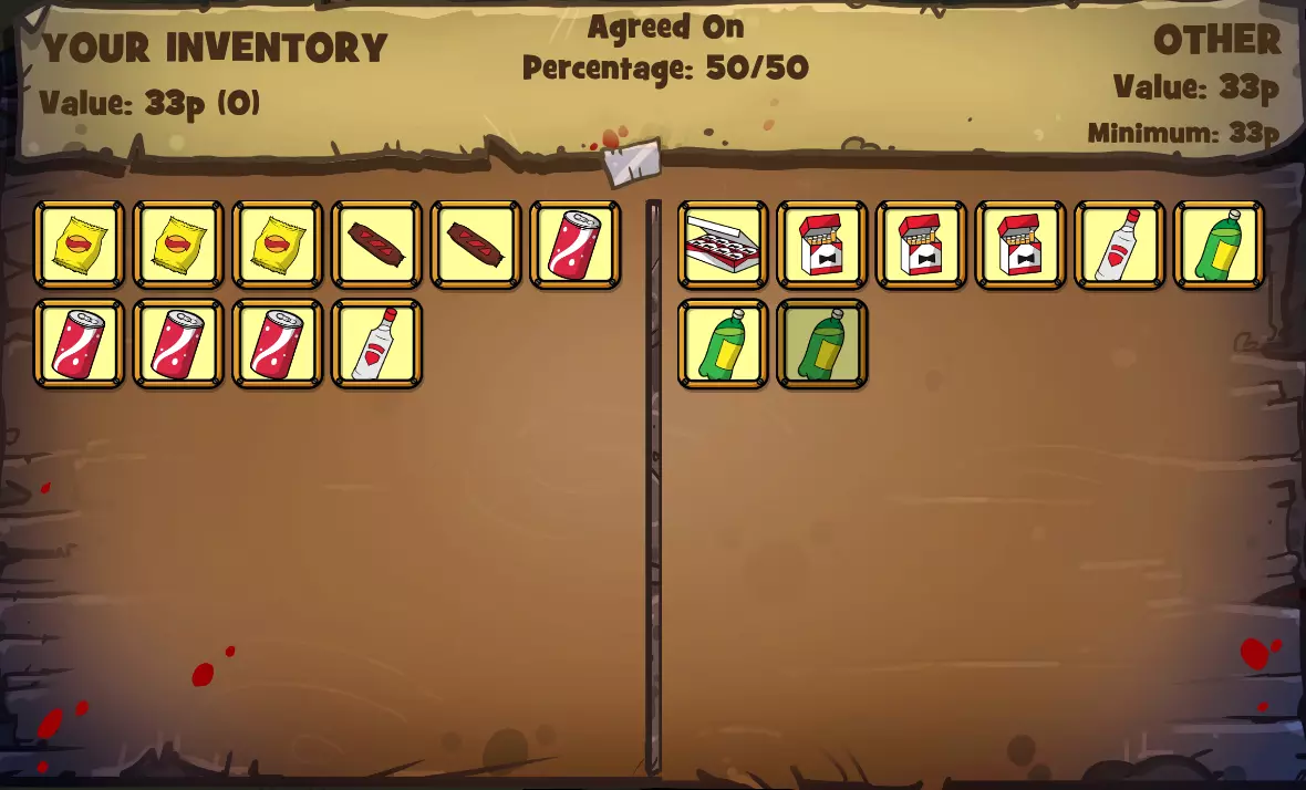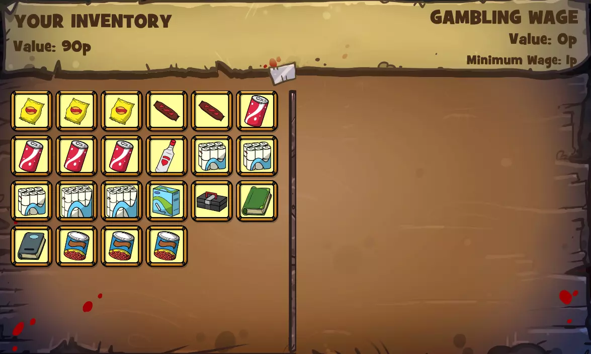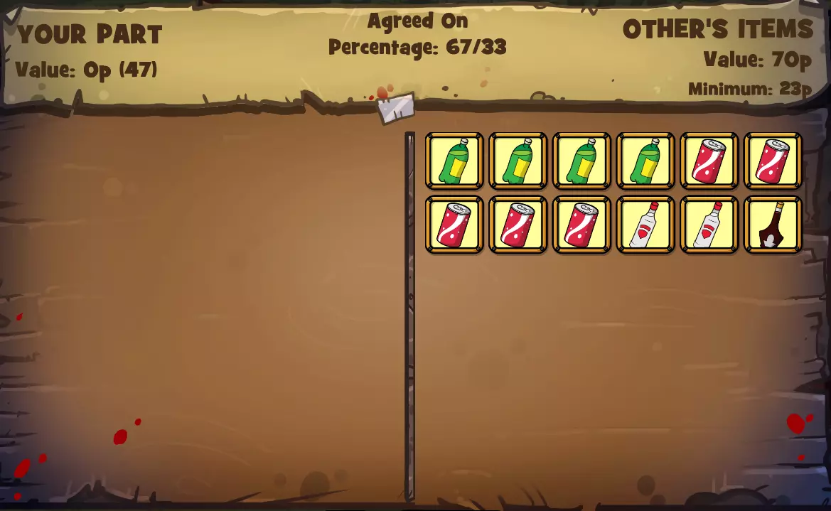 (注意我以9分获胜,因为斗牛犬的分数比我低,他需要掷第三个骰子才能至少追平我或获得完美的10分!)收回最初下注的45便士物品后(我没费心截图),这是从左侧斗牛犬的库存中选择的价值45便士物品的截图。现在我有价值90便士的物品(45便士+45便士=90便士),用来对抗斗牛犬剩余的72便士物品!