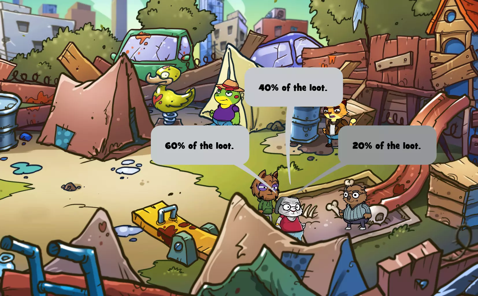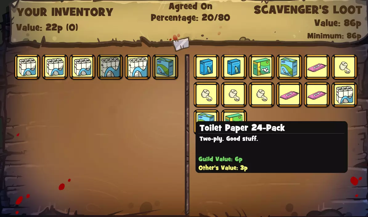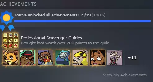 总结 总之,我主要做了以下这些事: - 如果能从 loot 地点拿走所有东西,我就都拿;如果不能,就拿公会价值最高的物品。 - 和 loot 伙伴分赃时,我会留下公会价值最高的物品。 - 我清空了 Bulldog 和赌博猫那里的物品。 - 我和两个营地的袋鼠女士以及青蛙先生交易,换取公会价值更高的物品,但我觉得这最终并没有增加太多分数。 - 我说服豚鼠 Elliot 和黄头发母山羊 Krista 深入 loot,以获取更多/更好的东西。 我认为,只要清空 Bulldog 和赌博猫那里的物品,并只选择最好的公会物品,或许就能顺利过关。或许催促埃利奥特和克丽斯塔进一步搜刮也会有所帮助。 我曾见过一些隐晦的说法,提到可以通过结束游戏来避免从头开始,但找不到任何指南专门强调这个技巧。我也不太确定它是否还能用! 希望本指南能更突出这个技巧,帮助大家完成所有成就,彻底结束这款游戏!