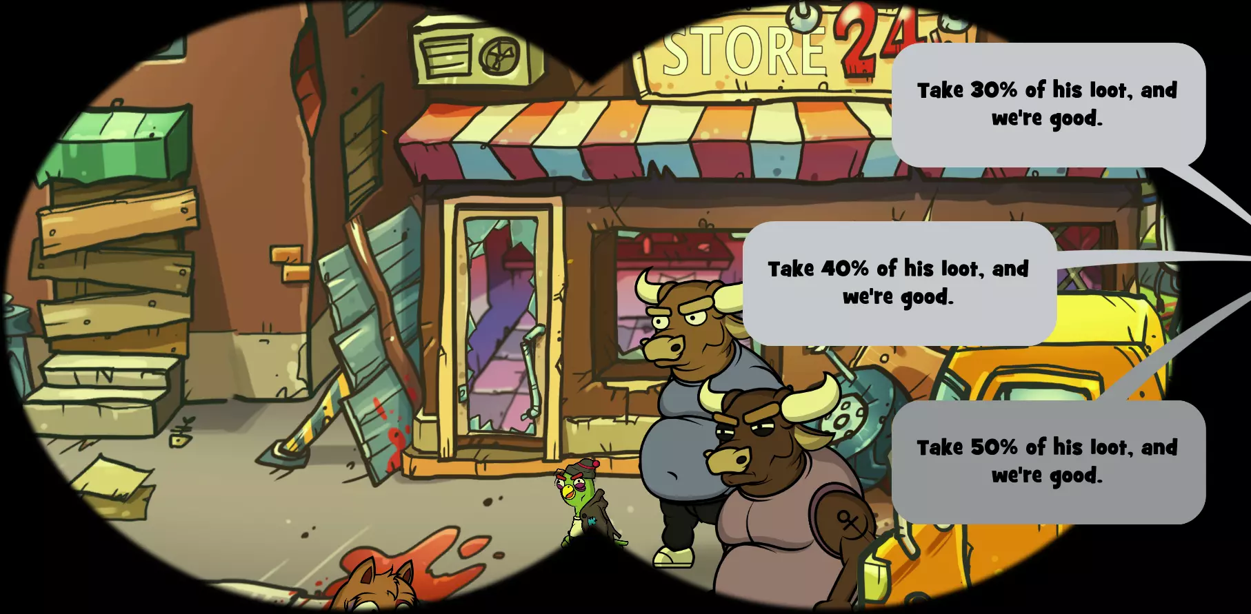 地点2:必要补给(豚鼠/埃利奥特) 现在你应该已经从公牛帮那里拿到了地图,然后你会遇到豚鼠埃利奥特,与他协商战利品分配比例为20-80。