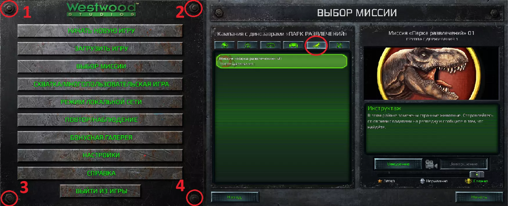 完成《泰伯利亚黎明》中的“游乐园”任务 在任意难度下完成所有“游乐园”任务。 “游乐园”的解锁方法: 要解锁“游乐园”,在游戏主菜单中按任意顺序点击螺栓,示例可参考截图。点击后会听到恐龙的咆哮声。如果没有反应,按住Shift键并再次点击四个螺栓。之后秘密任务将会解锁。接下来进入“任务选择”,点击出现的恐龙图标即可开始游戏。