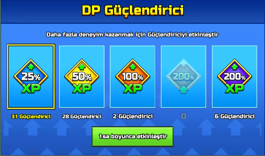 在您个人资料的右上角【DP强化器】区域,有5种不同的增益选项。起初我没有注意到这个功能,一直在未使用强化的情况下进行游戏,但实际上这些强化器非常重要。这里的25%和50%增益效果可能并不显著,但100%和200%强化对您的发展至关重要。强化道具的获取数量有限,因此当您决定进行1小时或接近1小时的游戏时,无论时长长短,都应开启强化以高效游玩(避免挂机)。25%和50%的强化可以在日常游戏中使用,而100%和200%的使用则尤为关键。