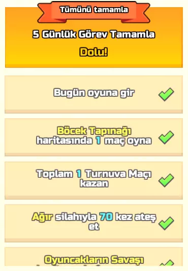 在选择准备加入的战斗模式时,你会看到模式上显示【2x】字样。每个战斗模式每天首次游玩都有额外的2倍经验值加成,在获得200%经验值之前请注意各游戏模式的加成,并且在强化器激活的1小时内留意每个游戏模式的加成。如果你等级还较低,不要在团队进攻和决斗模式中浪费时间使用强化器,这些模式中匹配不到玩家是正常现象。在一场普通的战斗胜利中,如果你的排名不错,将获得30 DP。凭借2倍奖励,你会得到60 DP,这相当于你每场首胜获得的DP奖励。但当你使用200%强化时,这次升级会提供120 DP,这意味着原本需要赢得4场战斗(大约16分钟)才能获得的奖励,你只需1场战斗就能得到,这样你就可以腾出时间去玩其他游戏模式,从而获得更多DP。当然,由于你无法获得太多200%强化,另一个可以替代使用的是100%强化,这也提升了你100%强化的重要性。使用DP强化并获得奖励后,团队比赛将是获取最多DP的方式,因为你不仅能从胜利中获得更多DP,而且团队战的获胜概率会根据生死等模式而更高。一场团队战结束后,如果你不继续留在当前地图,而是点击下方的随机地图选项,你将在当前房间中重新开始,不是进行4分钟的游戏,而是在另一张地图上开始一场随机比赛,通常你进入的比赛耗时不到4分钟,结束得更快,并且你获得的经验值与时间无关,击杀1-2名玩家就足以从该比赛中获得DP。 2. 每日奖励和任务