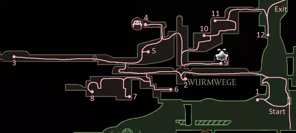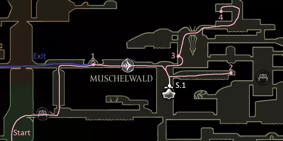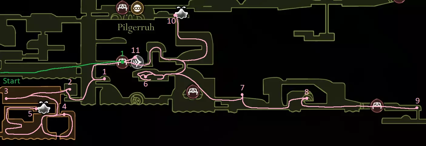 粉色路径:0.1. 在中途之家(前方竞技场)获取骨卷长凳。解锁捷径。2.2. 获取收割者纹章(如果实在不喜欢,可以稍后再拿,在第一次移动大篷车后获取)。击败沼翼。贝尔哈特 - 贝壳森林