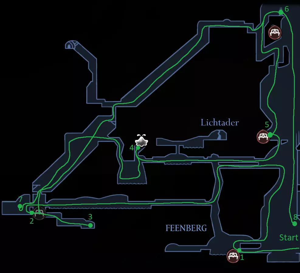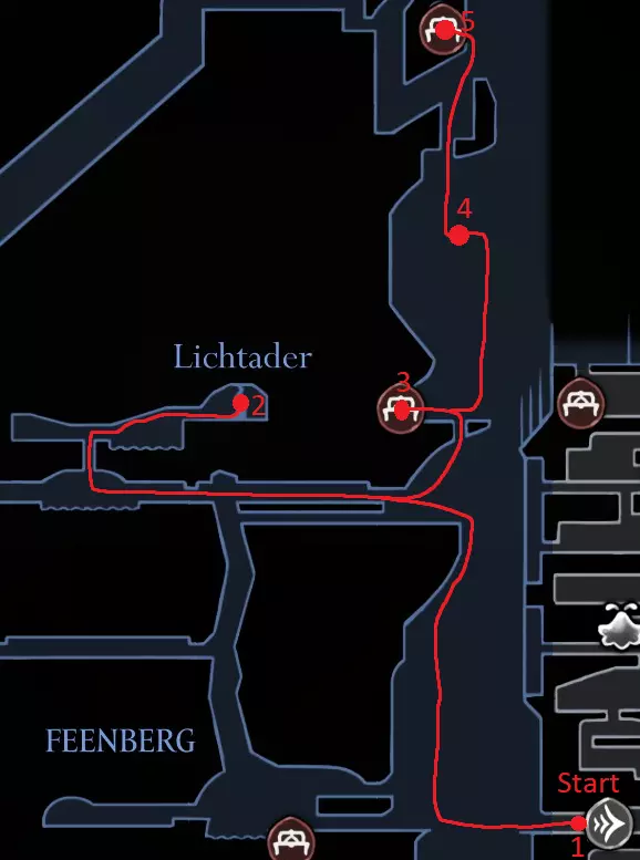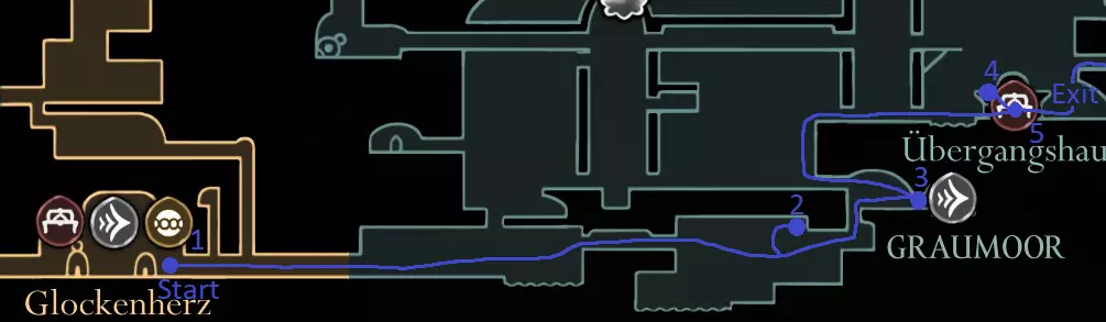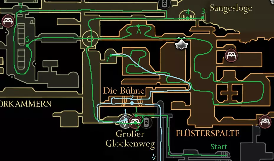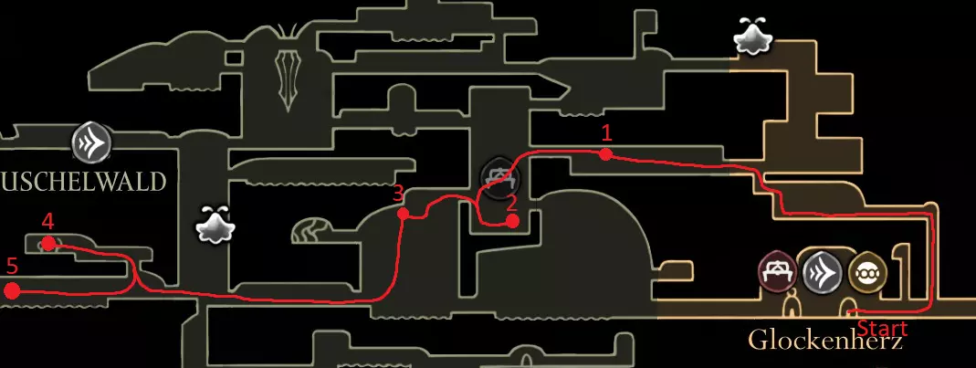 绿径路线:在贝尔韦上方获取记忆挂坠 在大贝尔韦休息,若能购买车站则购买,之后还有机会 获取白钥匙(可稍后购买) 在歌之clave休息 击败发条舞者 解锁下方的门 获取苍白精油 浅蓝色路线:在大贝尔韦休息,若之前未购买,可购买贝尔韦车站和文特里卡车站(若资金不足,可在车站左侧房间刷念珠) 前往贝尔哈特,获取第二次钉子升级 击败特拉比奥,在大贝尔韦取回爪形镜(工具:2/52) Speedrunner Achievement Start