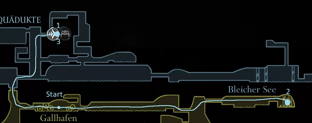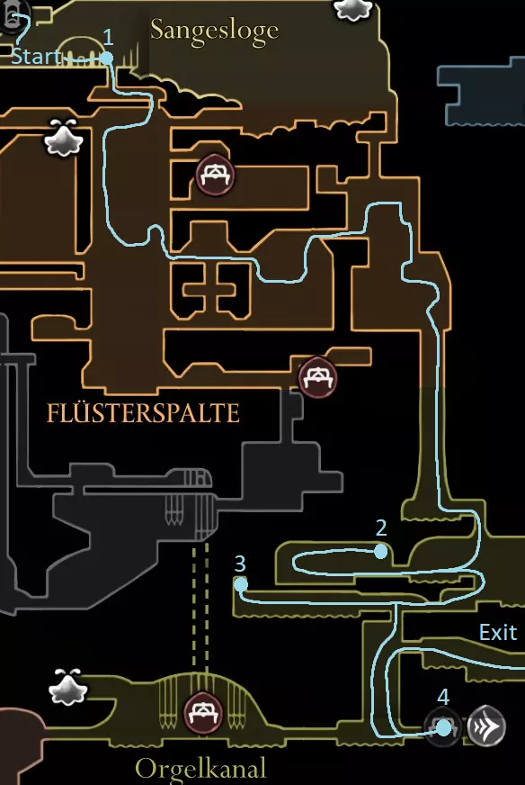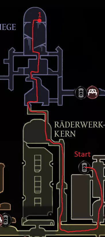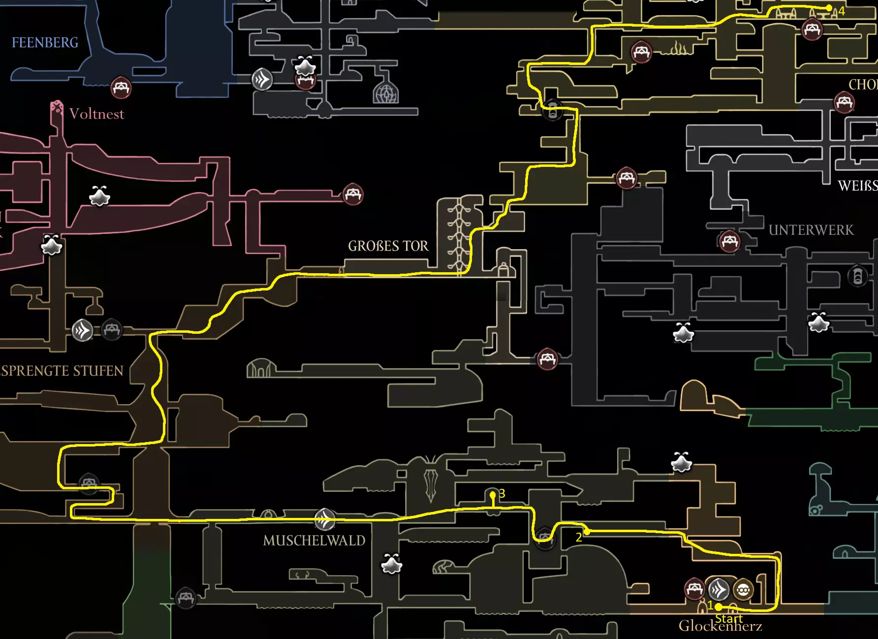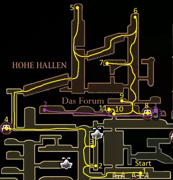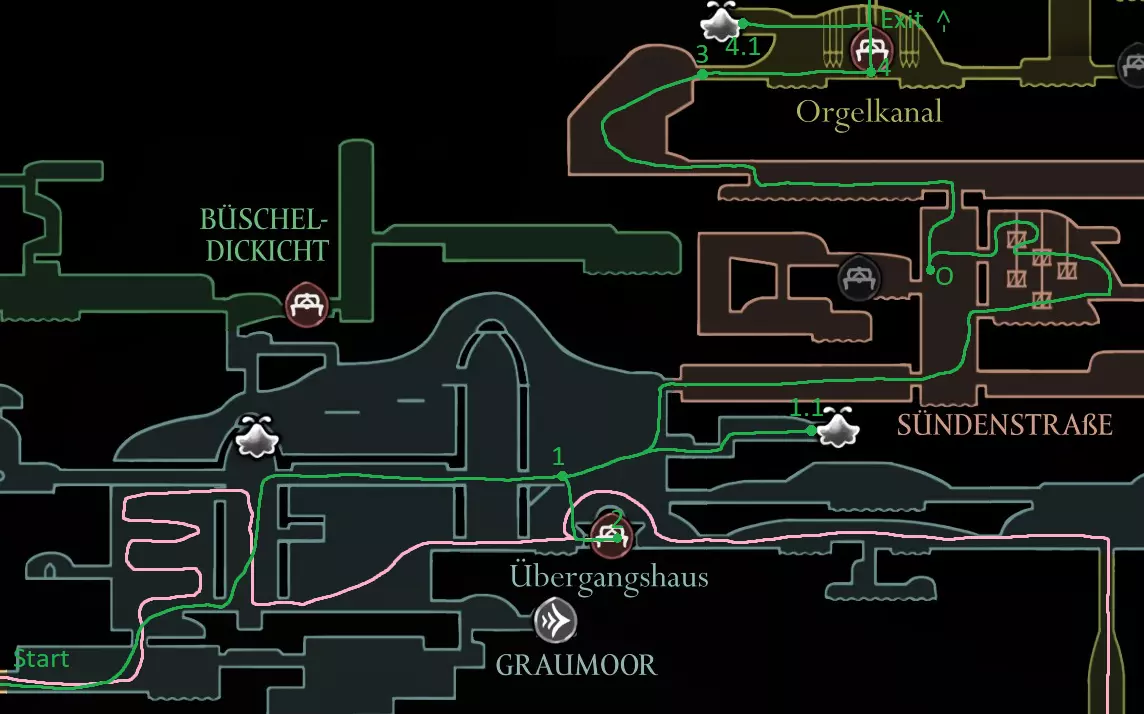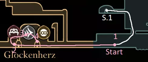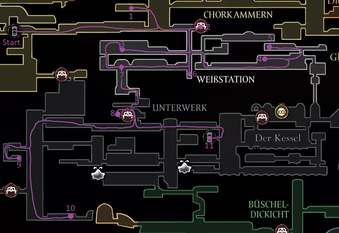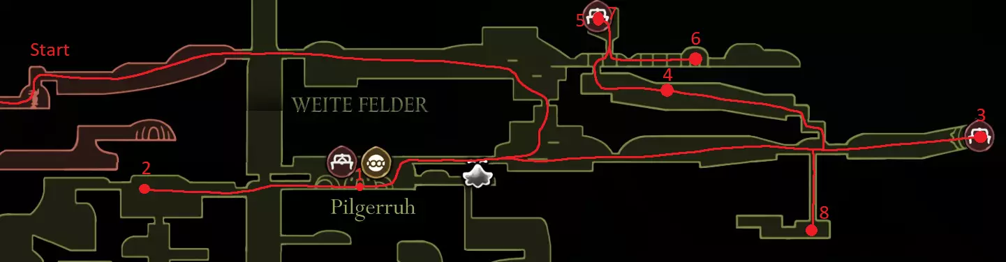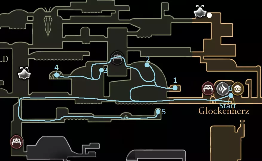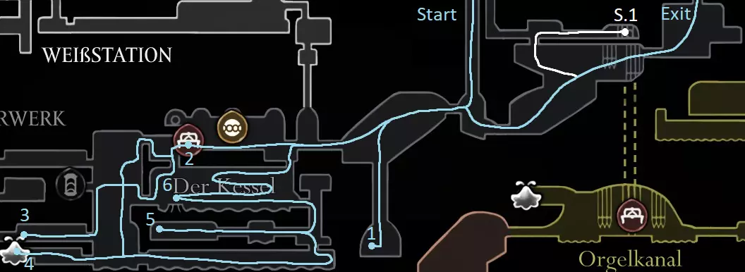 黄色路线:获取苍白油脂 激活风扇 打破墙壁,获取上方的跳蚤(23/30) 休息点 获取线轴碎片(9/18) 获取念珠 制作齿轮飞虫(工具:23/52) 休息点并购买文特里卡车站(80) 清除爪女(可跳过) 开启念珠刷取路径 使用简易钥匙,获取念珠和念珠加农炮(工具:24/52) 紫色路线:从温特里卡前往大钟楼,然后前往贝尔哈特进行下一次别针升级(450) 击败高厅竞技场,获取指挥家的旋律 从温特里卡前往合唱厅(需约100念珠) 白卫区