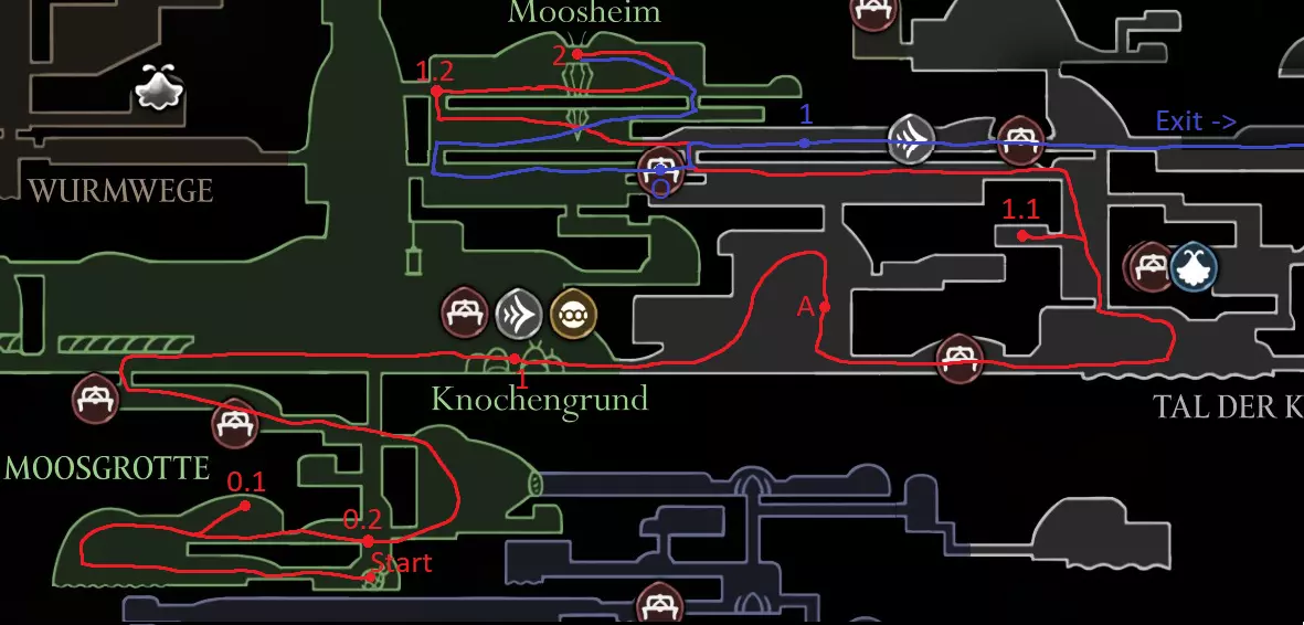 红色路径:0.1. 获取苔藓浆果 0.2. 跳下并拿起念珠 到达骸骨底部 1.1. 获取碎片吊坠(工具:1/52) 1.2. 打破左侧墙壁并获取圣歌戒律 获取丝绸矛 蓝色路径:O. 休息处 击败钟兽 深海码头