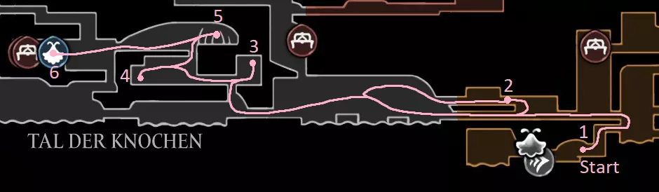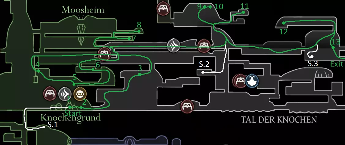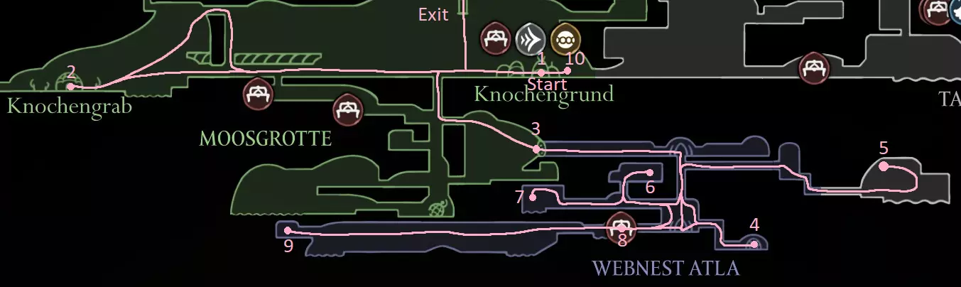 路线总览 获取冲刺 获取悬浮 获取爪钩 获取鱼叉 获取翅膀 获取钉子3 收集所有物品 进入第三章 获取丝绸翱翔 清理 获取3个旧心脏 击败失落蕾丝 为达成100%完成度,我们需要: 所有能力(9-11个) 所有丝绸技能(6个) 所有纹章(6个) 所有工具(52个)(51个+陷阱设置器) 所有查克拉地图 所有丝绸之心(3个) 所有面具碎片(20个) 所有线轴碎片(18个) 所有苍白精油(3个) 所有跳蚤(30个) 所有背包和制作升级(4/4) 路线(获取能力) 白色路径和标记有S的拾取物,如果你从一开始就使用本指南,则应跳过它们,这些是为使用正常速通成就存档文件的玩家准备的。 我会在路线上用O标记可选的休息点,用A标记竞技场。该成就根据游戏内时间计算,因此你可以暂停游戏休息(地图和物品栏界面可能也算入时间)。Bone Bottom - The Marrow
