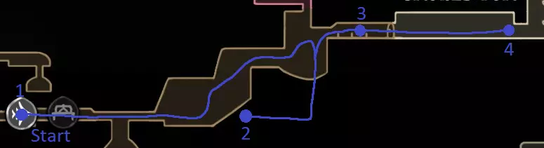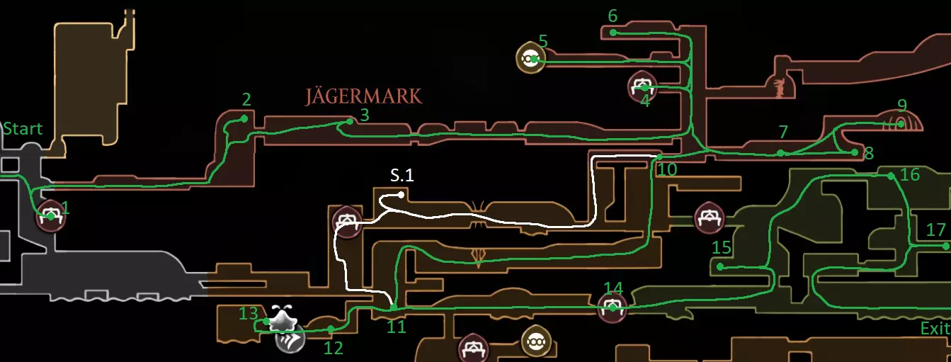 浅蓝色路径:在第一个房间跳下,获取线轴碎片(1/18) 休息凳 获取线轴碎片并解锁左侧路径(竞技场),然后返回休息凳(2/18) 获取跳蚤(6/30) 获取锻造金属(速通玩家可在此处直接返回休息凳) 获取鱼叉 S.1. 在排气器官中获取跳蚤(丝线补充轴左侧的隐藏房间) 低语拱顶