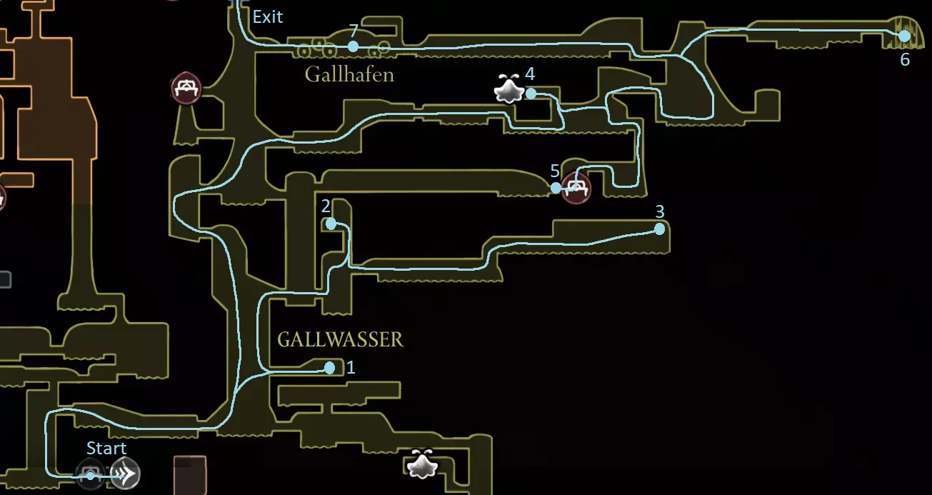 浅蓝色路径:从文垂卡前往颂歌圣所并接受“伤员的慰藉”任务(若之前未完成) 获取扭曲花苞 获取记忆挂坠 休息(60)并购买胆汁水贝尔韦站(80) 胆汁水