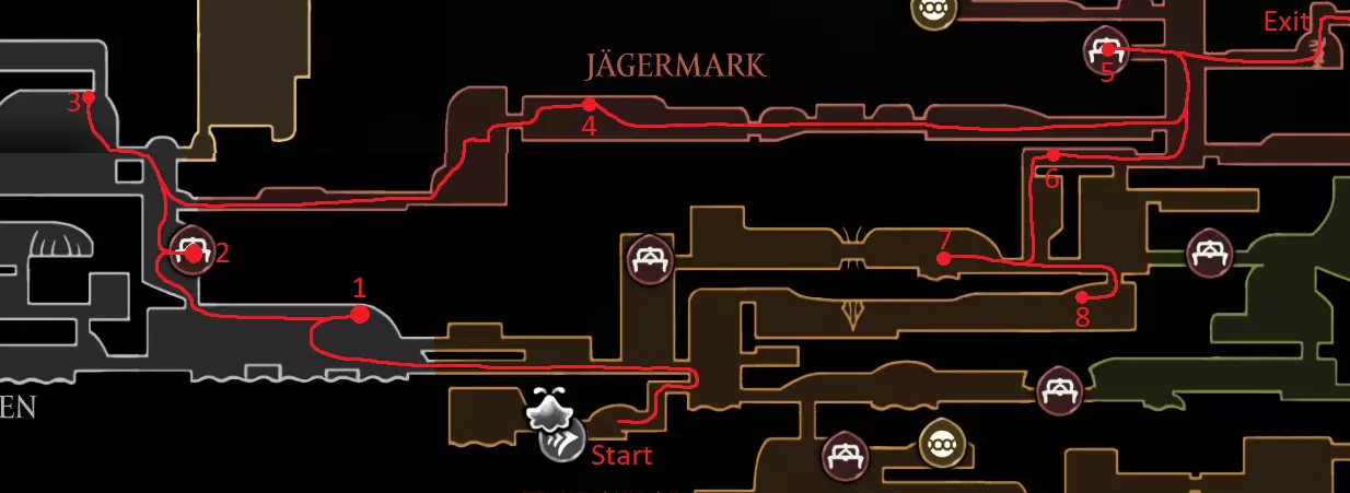 100%游戏攻略及路线:30小时内完成并获得Speed Completion成就 简介 大家好,这是一份100%完成度的攻略。我很高兴这款游戏如此出色,真的很棒。抱歉拖了这么久才发布,我知道已经有其他类似攻略了,但我已经开始制作了,希望这份攻略仍然有用。时间限制还是很宽松的,祝大家好运。 剧透提示 如果你已经获得了Speedrunner成就,可以使用该存档继续游玩。直接跳至【Speedrunner成就开始】部分,然后从那里继续,并留意白色路径和标记为S的收集品。 我的攻略思路是,优先快速获取所有移动能力,然后在清理部分地图的同时提升一些伤害,最后再清理剩余内容,因此舒适度方面没有过多考虑。在那之后,我们基本上就完成了游戏。 对我来说,两个主要难点是念珠和祈愿的路线规划。 关于念珠,我加入了一种刷取方法,并且在每个贝尔韦站(以及一些文特里卡站)旁边都标注了到下一个贝尔韦站所需的念珠数量,所以如果数量不够,就去刷一些。 至于祈愿,我尽最大努力规划了每一个祈愿的路线,但尤其是狩猎祈愿,你只能在游戏过程中完成,或者在游戏结束时集中刷取。有些祈愿我不确定触发条件,所以要经常查看任务板并及时提交任务。