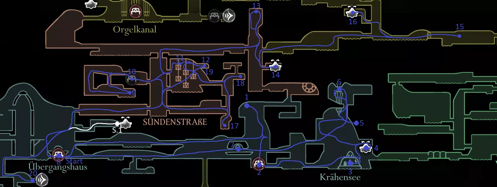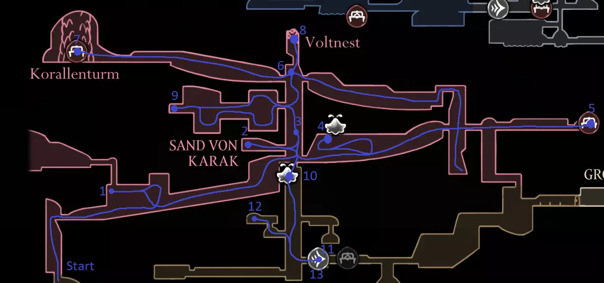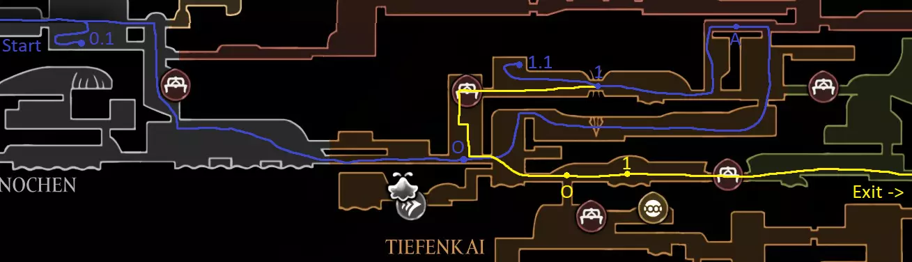 深蓝路线:0.1. 获取工艺金属,获取冲刺 1.1. 获取跳蚤(1/30) 黄色路线:O:你可以在更靠近蕾丝的地方休息,但这被竞技场锁定,击败蕾丝 远场