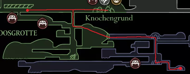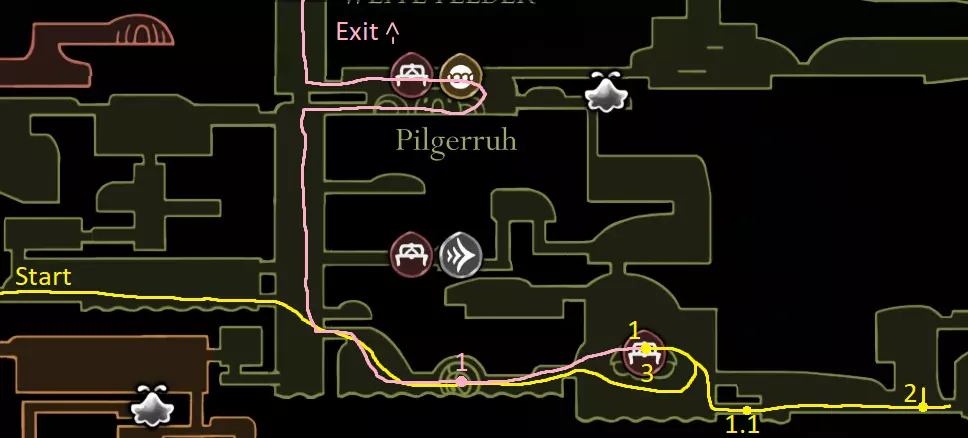 粉色路径:贝尔哈特的长椅(前方竞技场) 1.1. 获取跳蚤(2/30) 提示:有一个敌人弹跳技巧可以跳过分裂姐妹 获取爪钩 绿色路径:0.1. 获取跳蚤(3/30)击败寡妇 购买贝尔哈特贝尔韦站 获取第一次钉子升级并接受所有愿望 银铃 我失踪的信使 爬虫清理 灰沼 - 罪人之路