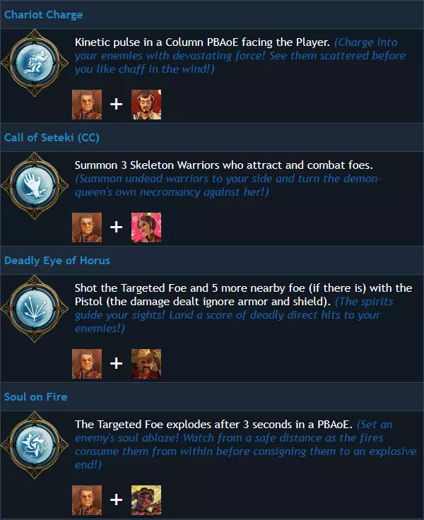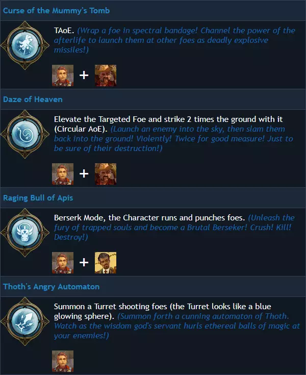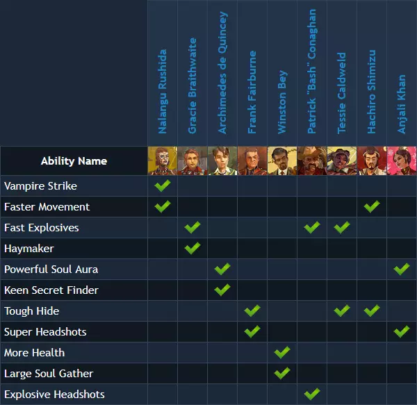 本Steam指南旨在帮助新玩家通过对比角色的被动技能和护身符来选择合适的角色。 角色(标准版) 简介 游戏本体包含4名可玩角色。玩家可任意选择(无需解锁)。《奇异小队》中另有5名可玩角色,无法通过游戏内游玩解锁,仅可通过购买DLC获得。 单人模式中没有AI队友,游戏完全支持单人游玩,且无任何玩法上的劣势(不过只有阿基米德可以开启并进入包含非必要宝藏的远古壁龛)。 合作模式中,两名玩家可以选择相同的角色。团队内的金钱、宝石和罐子不共享,而猫咪与 relic 是共享的。游戏内角色描述 纳兰古·鲁希达(前恶魔猎人):“多年严苛的猎魔训练赋予了纳兰古迅捷的反应能力和对危险的第六感!” 格雷西·布雷斯韦特(前拳击手):“这位兰开夏姑娘擅长使用爆炸物和徒手格斗!在近距离战斗中非常实用!” 阿基米德·德·昆西(前学者):“凭借对魔法的亲和力,阿基米德拥有更大的灵魂收集范围以及开启古老壁龛的能力。” 弗兰克·费尔伯恩(前雇佣兵):“一生为国效力让弗兰克拥有了相当坚韧的外表,以及相当致命的爆头技巧!” 游戏内日志传记