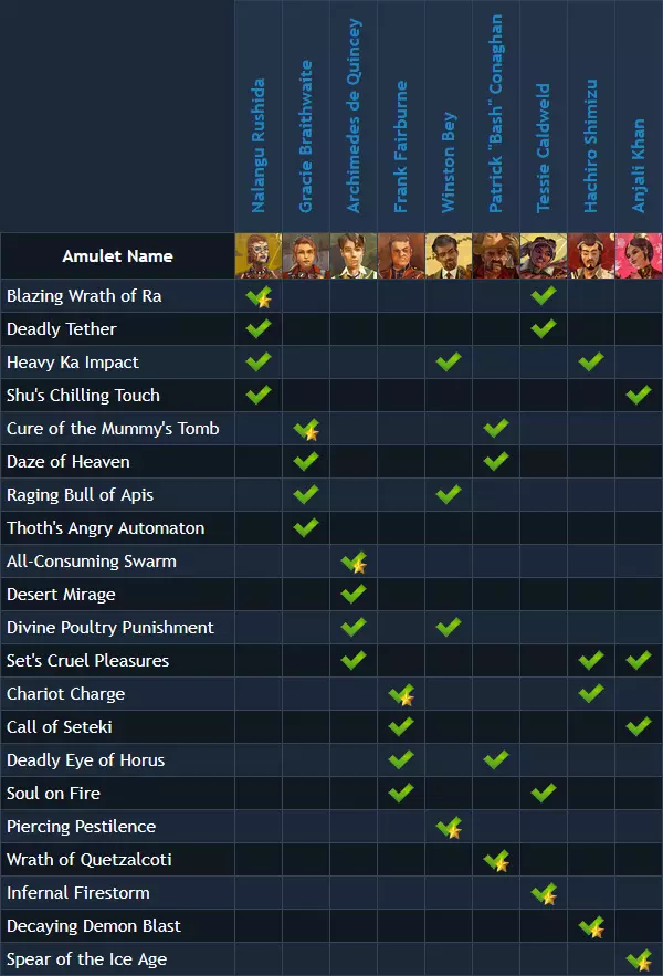 坚韧外皮(生命值加成):增加最大生命值。 超级爆头:爆头时造成更高武器伤害。 更多生命(生命值加成):增加最大生命值。 灵魂虹吸范围扩大:扩大灵魂收集区域的半径。 爆裂爆头:爆头时造成更高武器伤害。 护身符能力 简介 游戏中有21种不同的护身符能力。奇异小队的每位成员(9个角色)初始拥有1个已解锁的护身符能力,以及最后12种中的3个未解锁能力。玩家需要使用辛苦获得的技能点来解锁这12种护身符能力。 部分护身符能力为角色特有,其他则由多个角色共享。当你解锁一个共享护身符能力时,所有可使用该能力的角色都将解锁它。为便于说明,我制作了一张表格,其中9种初始护符能力已用黄色星星标记。