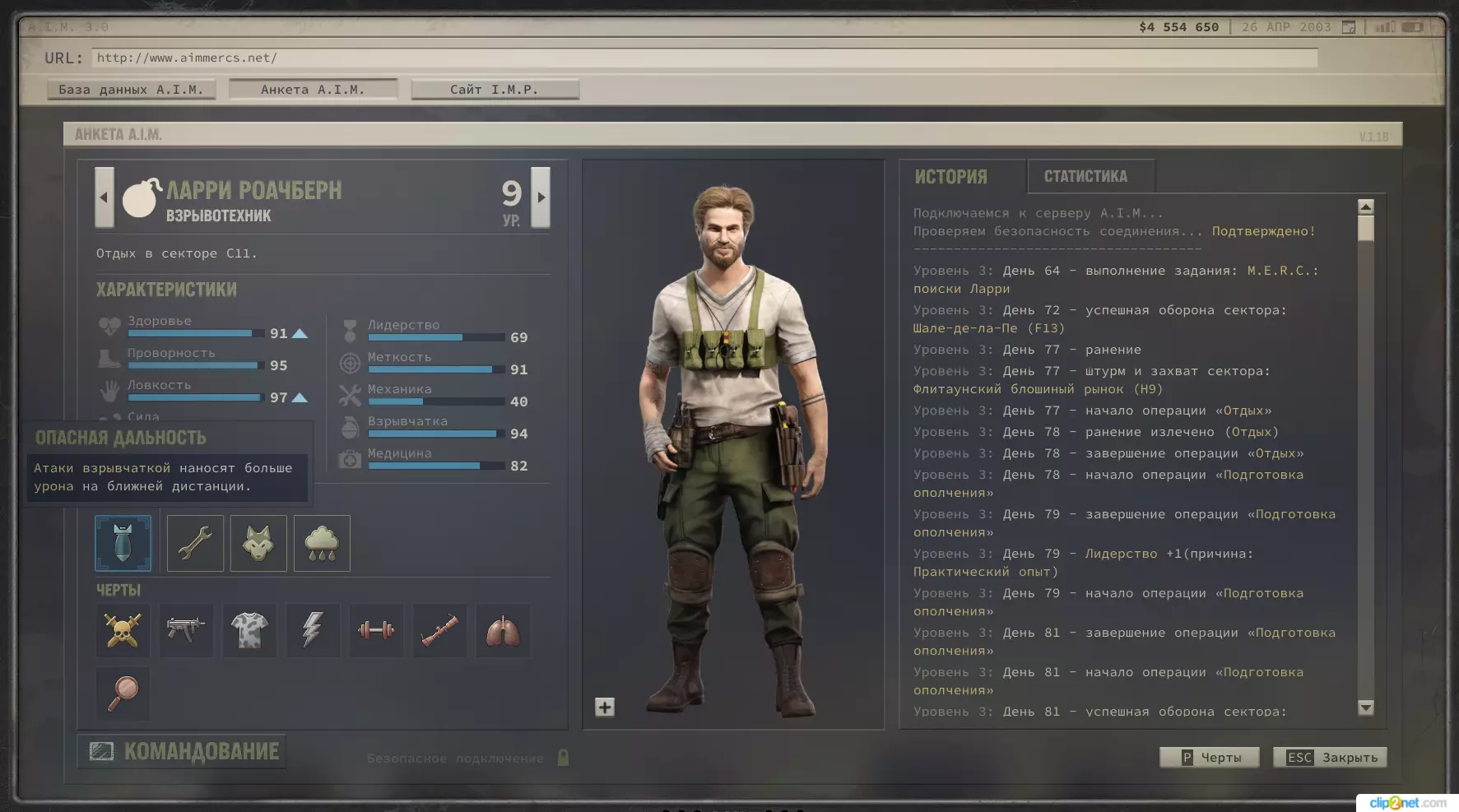 要将驯兽师纳入麾下,首先需要前往C5区域的盗猎者营地。击败军团士兵后,你可以与该团体的领袖“豺狼”吉尔伯特交谈,他会向你讲述自己的麻烦。此外,在这里还可以购买带热成像仪的狙击步枪。 需要找到三具带有鹿角的盗猎者尸体。 其中一具位于C6区域。探索区域,直到在尸体上方看到放大镜图标,检查该尸体以获取提示。 另外两具尸体位于【B4】区域(如果您从【E6】区域开始并在那里找到了第一具尸体,而最后一具尸体在【C6】区域,那么食尸鬼就位于洞穴内部)。 要招募食尸鬼,您需要队伍中有一名智力值达到90或以上的成员。如果您没有这样的成员,可以招募巴里。与三个灌木丛中的最后一具尸体互动后,会出现“ Живодёр”,你可以和他对话。不要说他疯了,只需问他为什么这么做,然后告诉他需要停下来。不要选择“不想去猎杀敌人吗?”这个对话选项,应该选择“想和我们一起去打猎吗?”,这会触发智力检定。让吉沃杰拉加入队伍,并向走私者们展示,告诉他们他现在和我们一起接受改造。 拉里·罗奇伯恩