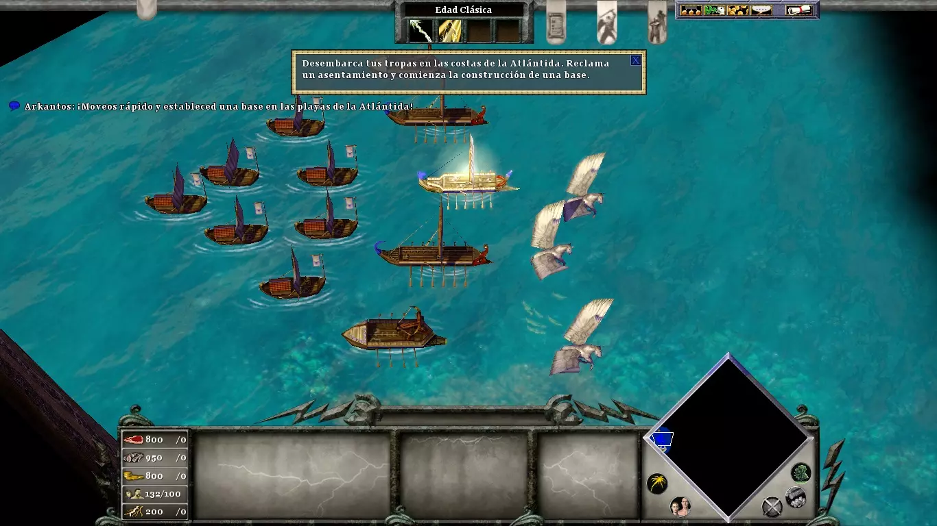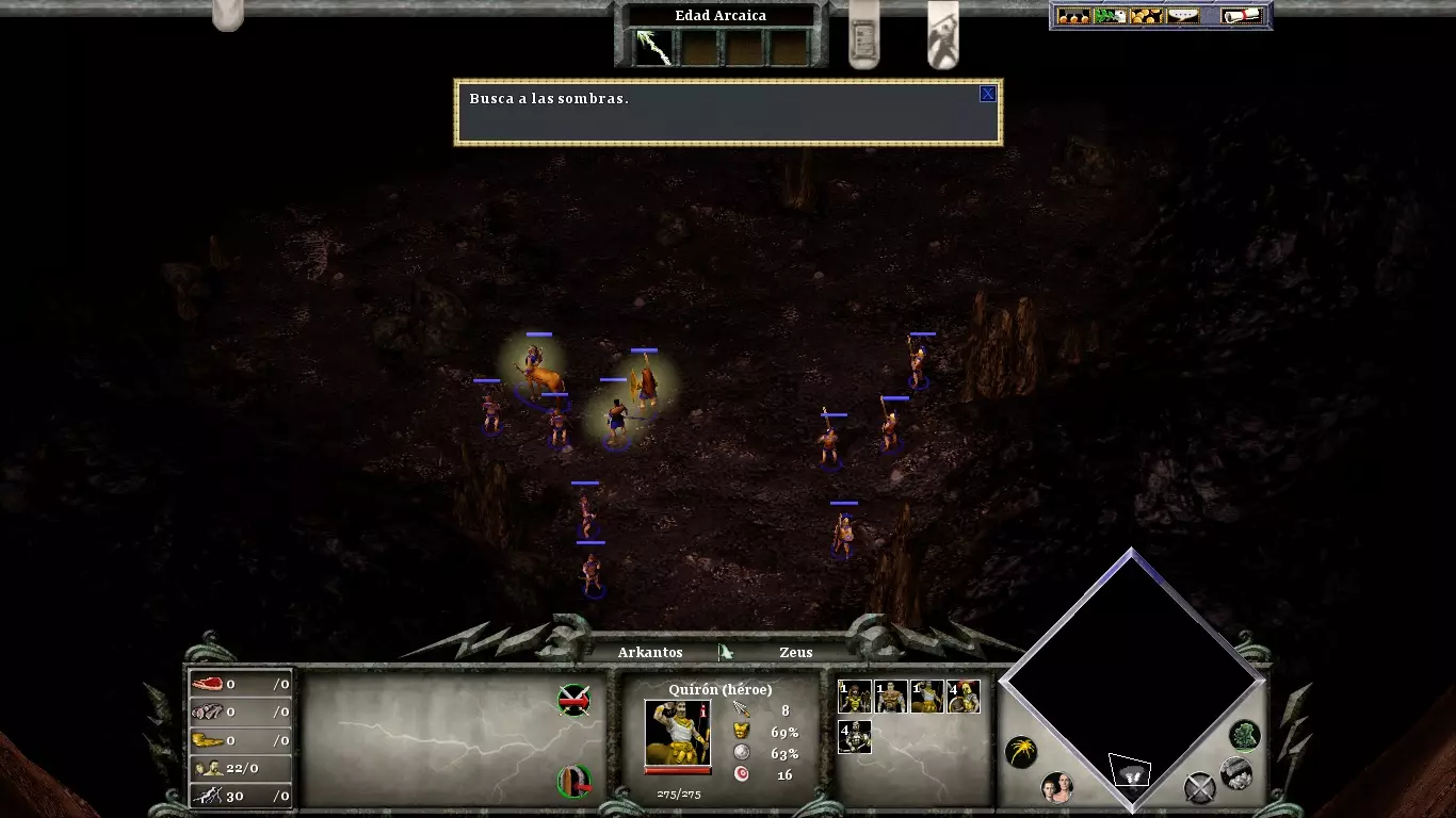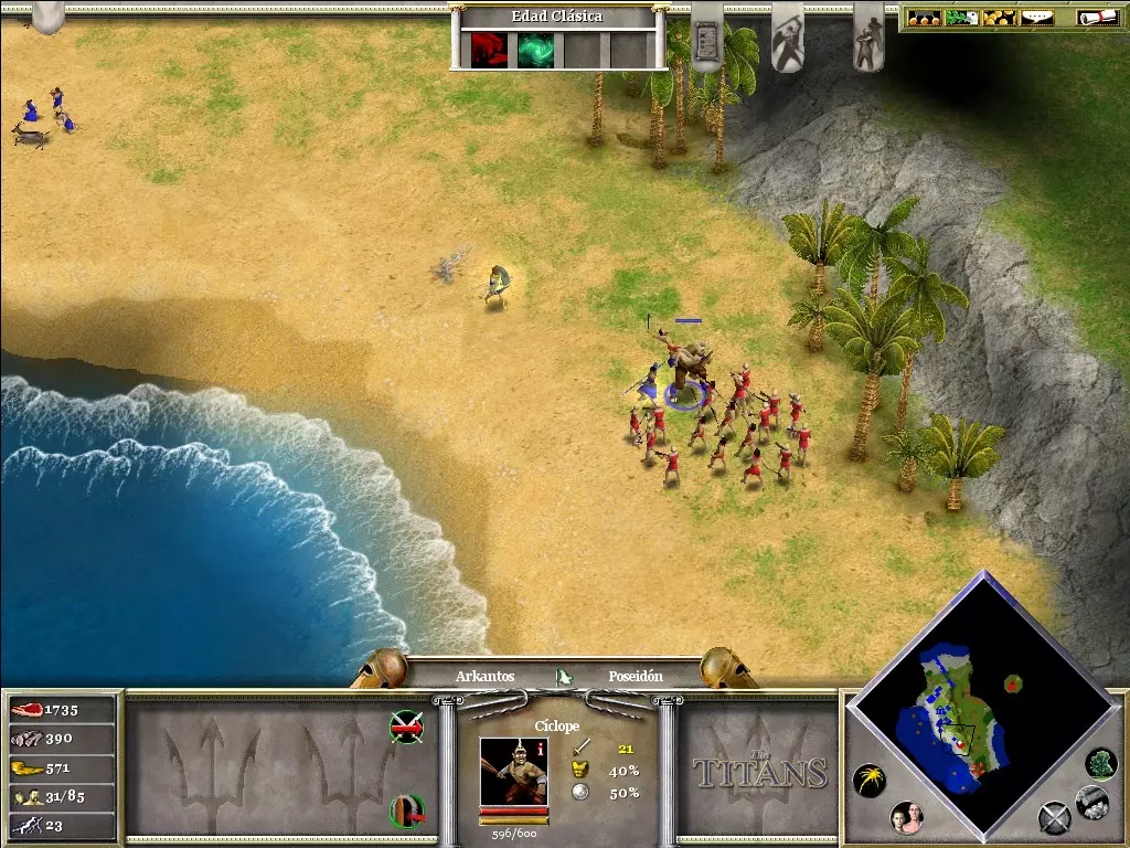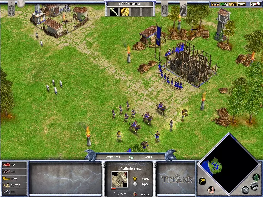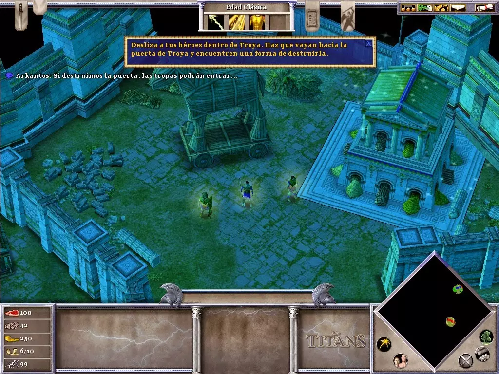 你将非常需要黄金(尤其是用于时代升级和训练士兵)。在你的城市北部有一座金矿,如果你不想让你的矿工在每次敌人围攻时都丧命,就必须保护好它。不要忘记在你的市中心附近使用“诱饵”;它吸引来的动物将是游戏初期重要的食物来源。当你正遭受敌人猛烈攻击时,或者当你准备进攻敌人(为了进入敌对领土而不受伤害)时,可以使用“停火”。阿伽门农登陆后,你可以派遣他的部队前往剩余的敌方定居点,或者派往你的村庄,以防御可能的敌人攻击。