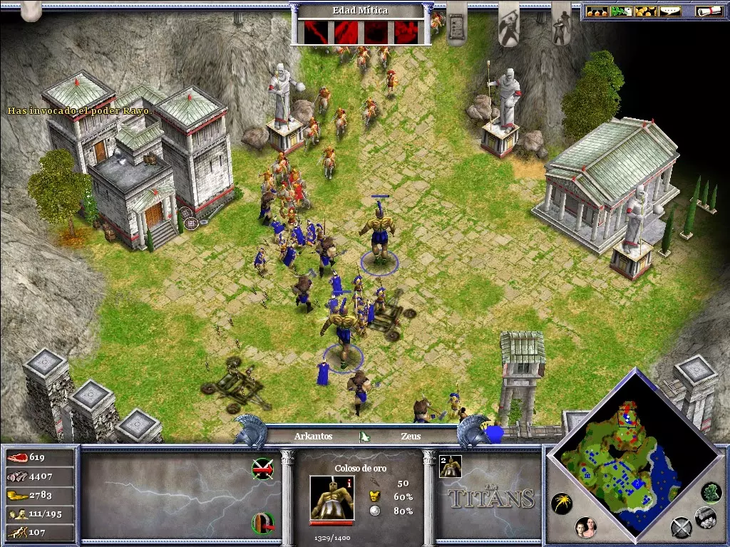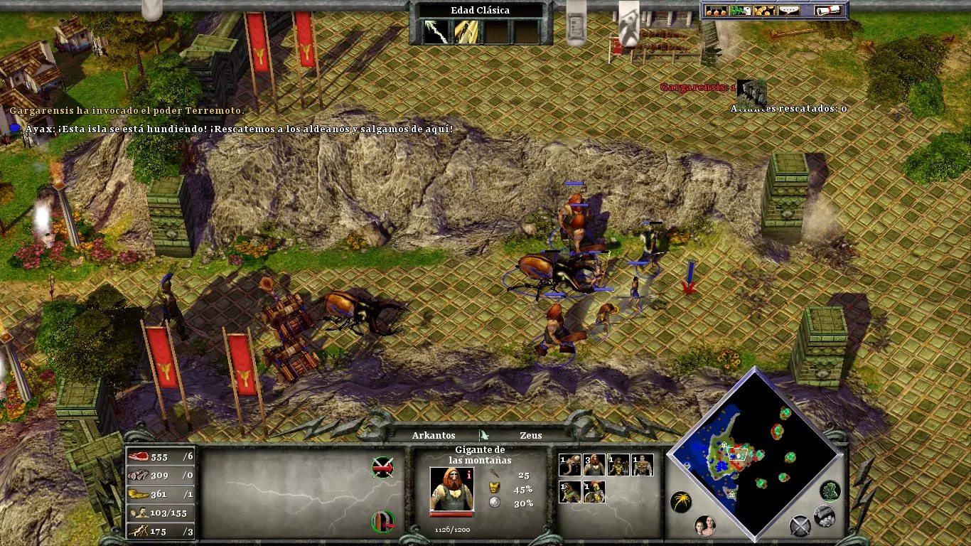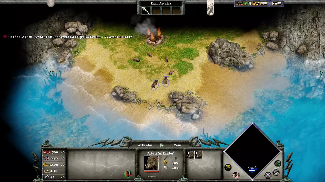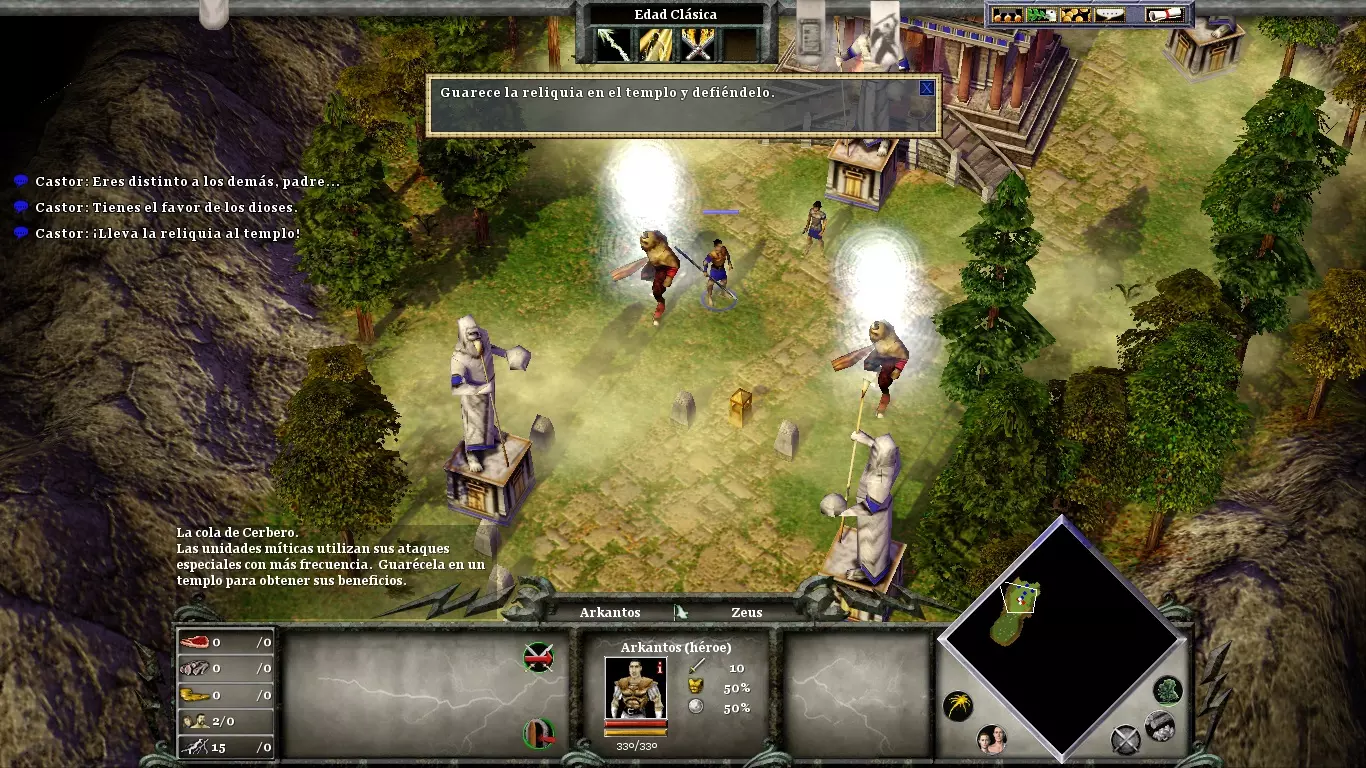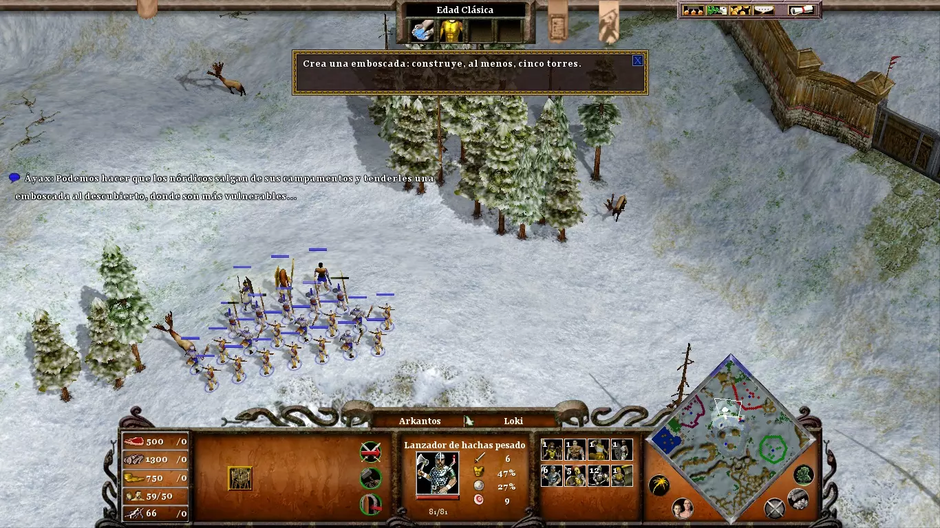你将非常需要黄金(尤其是用于时代升级和训练士兵)。在你的城市北部有一座金矿,如果你不想让你的矿工在每次敌人围攻时都丧命,就必须保护好它。不要忘记在你的市中心附近使用“诱饵”;它吸引来的动物将是游戏初期重要的食物来源。当你正遭受敌人猛烈攻击时,或者当你准备进攻敌人(为了进入敌对领土而不受伤害)时,可以使用“停火”。阿伽门农登陆后,你可以派遣他的部队前往剩余的敌方定居点,或者派往你的村庄,以防御可能的敌人攻击。