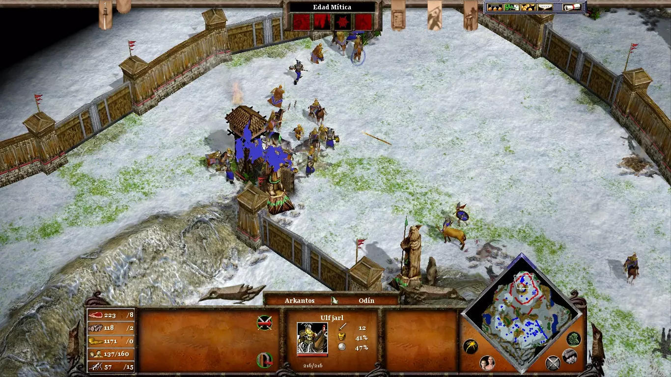 你的初始十分钟不仅要建造防御工事,还要建立稳固的经济。利用这段时间大量生产村民。你的定居点南部有一个通往加尔加伦西斯地狱的通道。尽快摧毁它,以阻止来自南方的袭击。在村庄入口处建造城墙,但不要盲目相信它们能抵御围攻(记住,北欧城墙是游戏中最脆弱的)。相反,用堡垒和大量装备改良盔甲的人类士兵进行防御,以充分利用这个文明的优势。在尤利西斯抵达前约五分钟时使用“诸神黄昏”能力。如果过早使用,可能会严重损害你的经济。