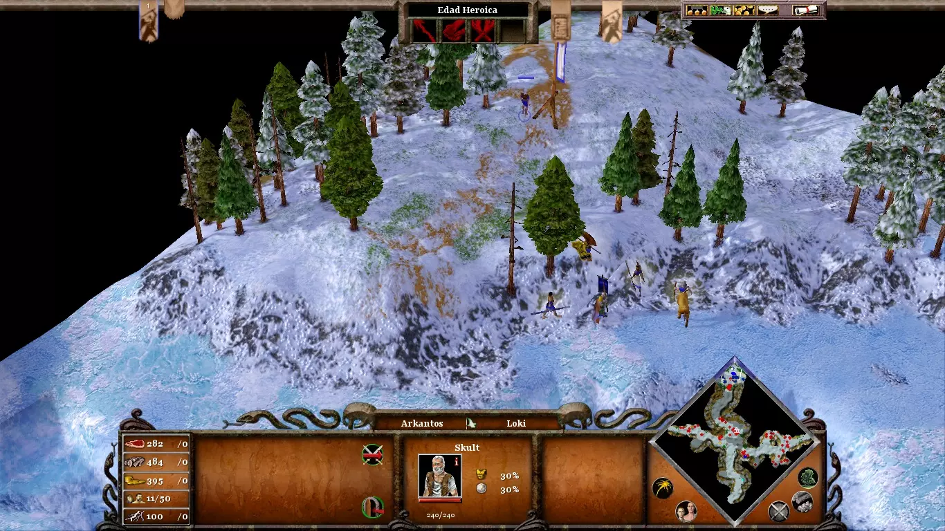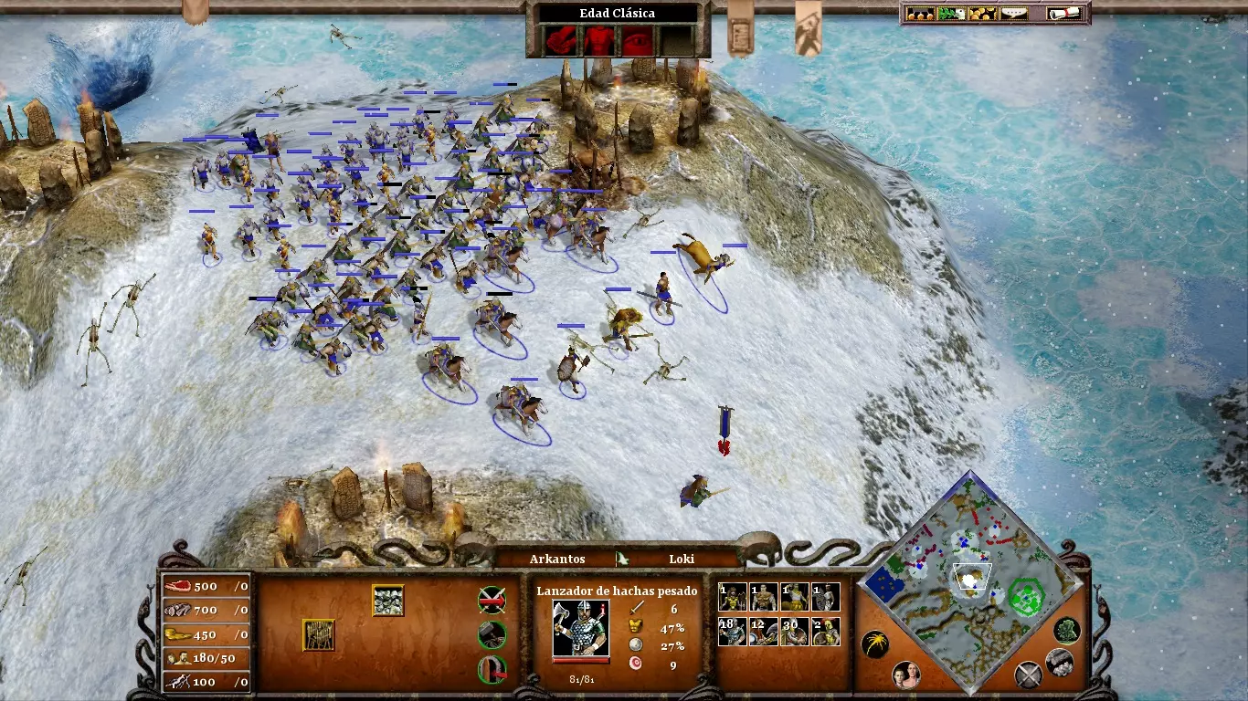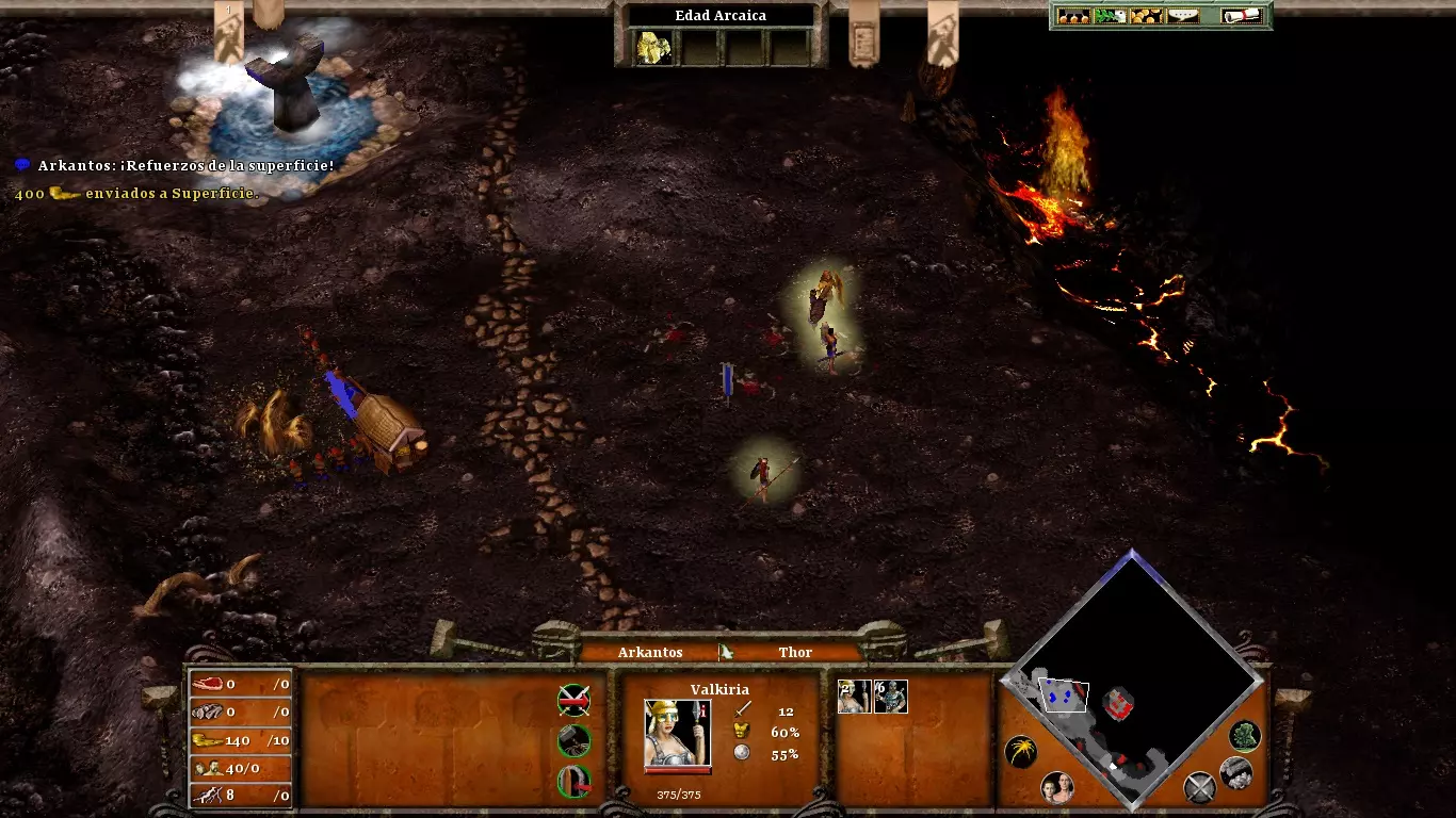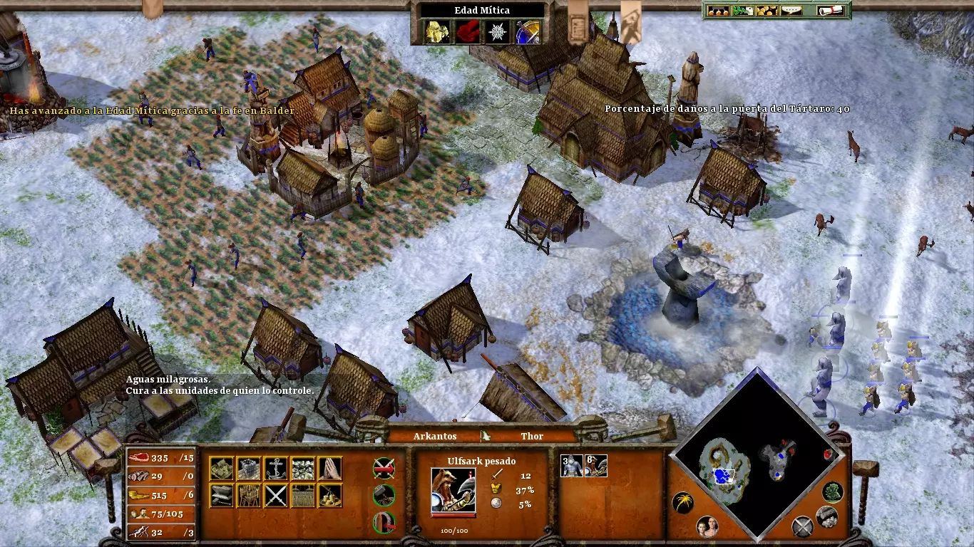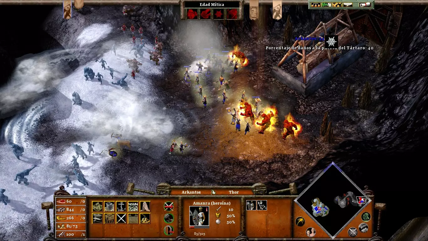 派你的矮人去冥界采矿。只要别让他们太靠近前线,就不会受到敌人的骚扰。不要拖延狂战士的建造;他们在应对敌人的快速突袭时会很有用。快速升级到神话时代,将你的村民转变为诸神黄昏英雄。然后,派他们到城门参战,并对敌军使用“寒冰”之力,注意不要冻结他们的火焰巨人,这样之后就能轻松消灭他们(类似上图所示的情况)。只需杀死他们就能完成这一阶段。(内容无法识别,已删除)