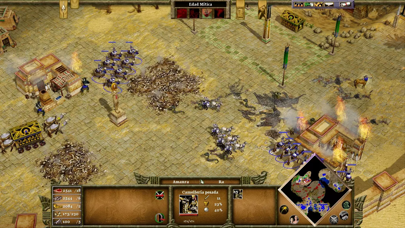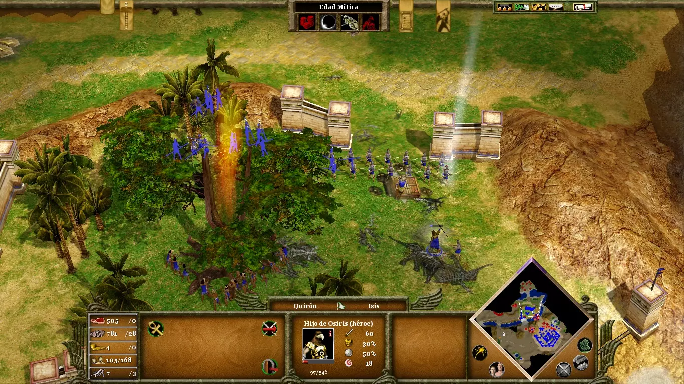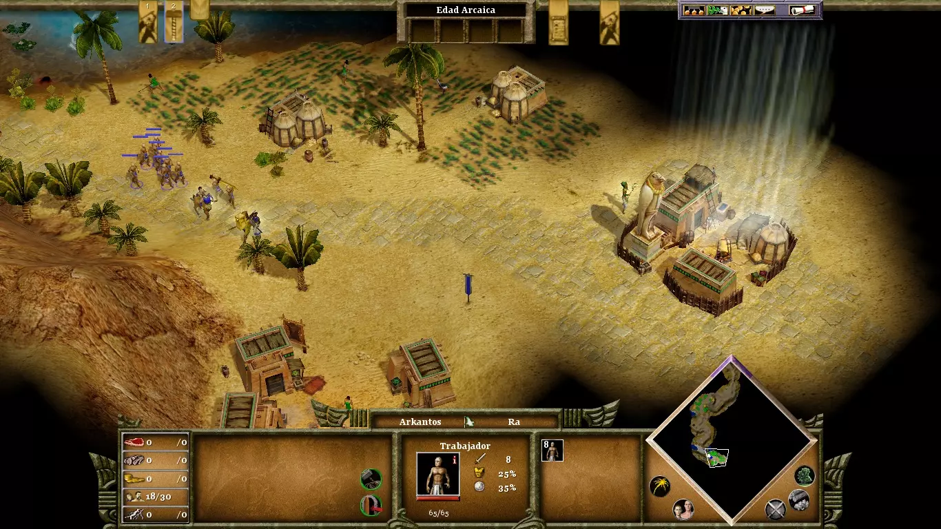 没人催你砍柽柳,那棵树哪儿也不会去。你首先要纯粹专注于你的经济,只有当你拥有充足的资源和庞大的军队后,再派村民去完成目标。用大约35个樵夫,柽柳很容易在三四分钟内被砍倒。来自坟墓的木乃伊是中立单位,但对你造成的麻烦会比对你的敌人更大。至关重要的是,你要摧毁它们的来源——修道院(一个在你的营地右下方,另一个在地图的最左端),因为你会获得黄金作为奖励,而黄金在这个阶段既必要又稀缺。用城墙封闭你的营地,以保护村民免受敌方木乃伊的攻击;这些木乃伊在摧毁建筑方面十分致命。敌人拥有许多战象:它们非常强大、极具威慑力且抗性很高,但和其他任何单位一样容易被转化为你的附庸。因此,在进入神话时代时,不要忘记创建你自己的木乃伊。长矛兵和骆驼兵对于对抗战象也很有用。