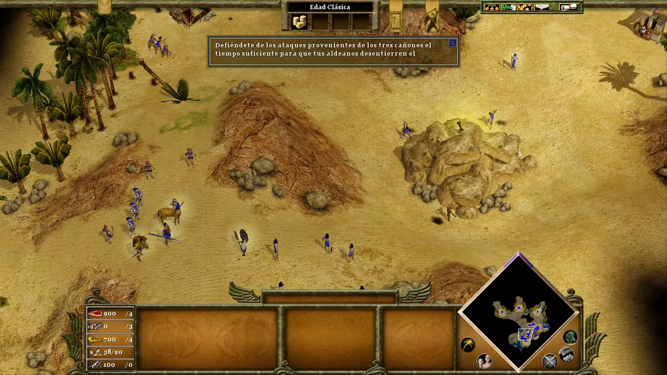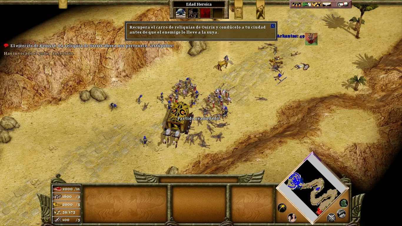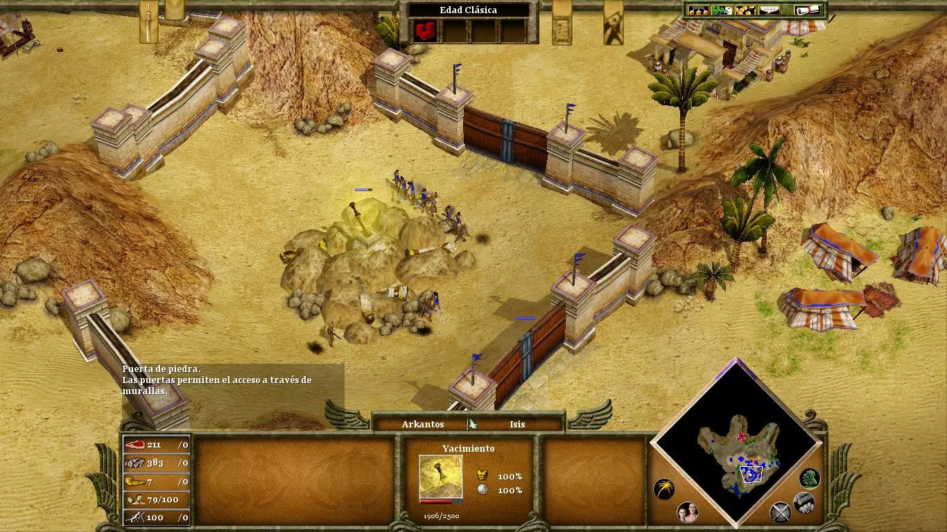 没人催你砍柽柳,那棵树哪儿也不会去。你首先要纯粹专注于你的经济,只有当你拥有充足的资源和庞大的军队后,再派村民去完成目标。用大约35个樵夫,柽柳很容易在三四分钟内被砍倒。来自坟墓的木乃伊是中立单位,但对你造成的麻烦会比对你的敌人更大。至关重要的是,你要摧毁它们的来源——修道院(一个在你的营地右下方,另一个在地图的最左端),因为你会获得黄金作为奖励,而黄金在这个阶段既必要又稀缺。用城墙封闭你的营地,以保护村民免受敌方木乃伊的攻击;这些木乃伊在摧毁建筑方面十分致命。敌人拥有许多战象:它们非常强大、极具威慑力且抗性很高,但和其他任何单位一样容易被转化为你的附庸。因此,在进入神话时代时,不要忘记创建你自己的木乃伊。长矛兵和骆驼兵对于对抗战象也很有用。