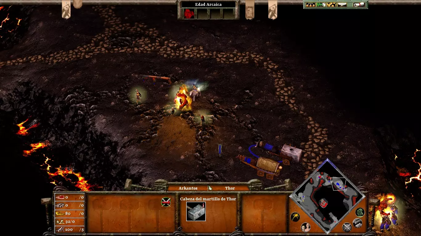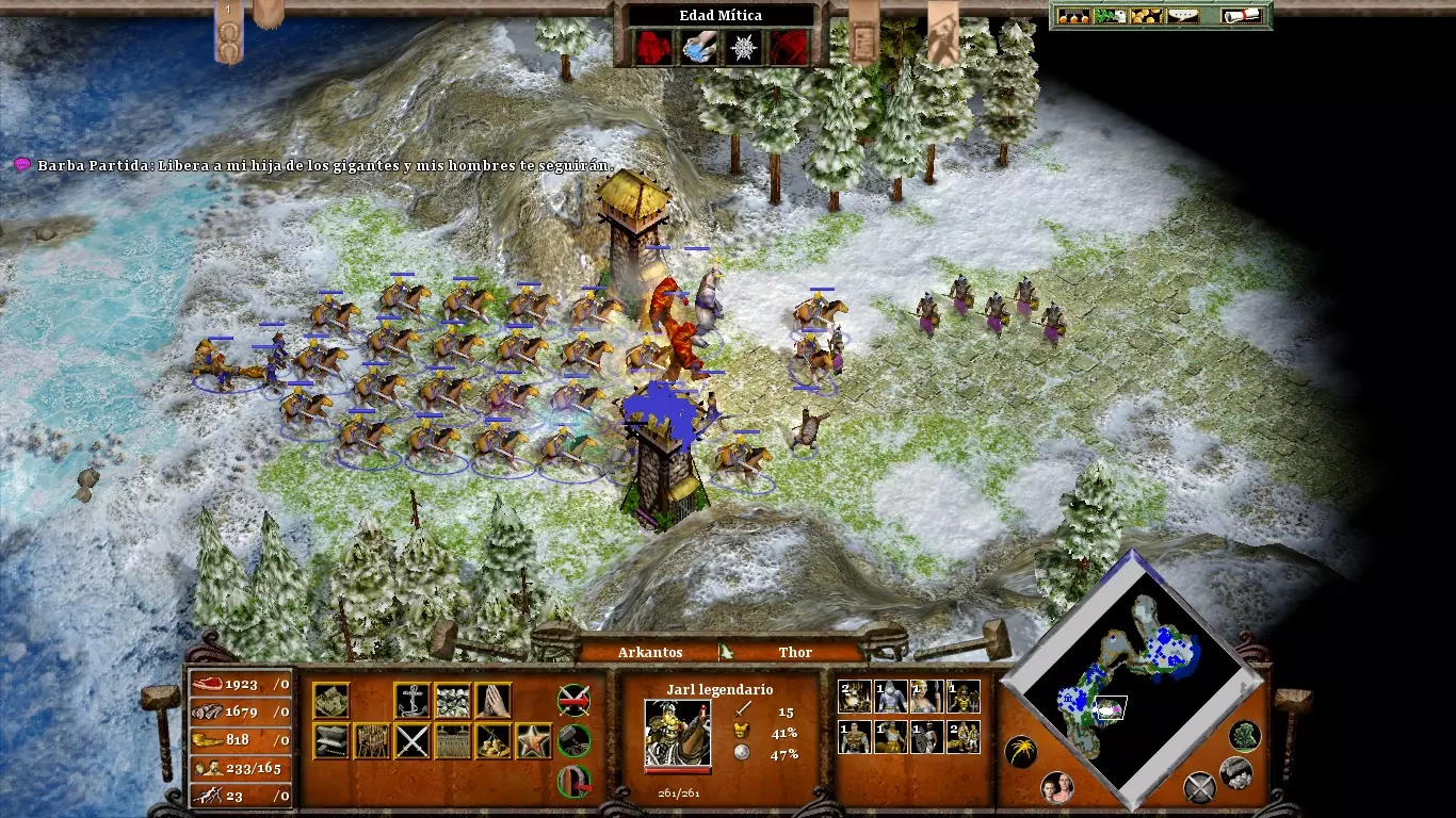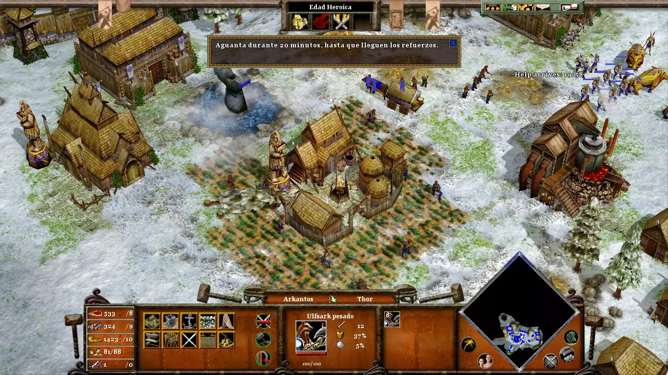 首先,派遣所有村民去采集黄金。只有当你开采完所有黄金(初始矿场和雷神矮人矿场的黄金)后,再派矮人去砍伐树根。伊特里的部队数量相当有限,因此最好让装备锤柄的布罗克前进,而不是相反。两者之间的一个良好会合点已在上方某张图片中标出。派遣你不再使用的单位(例如矮人或掷斧兵)去拦截从大门出现的巨人军队。这样可以牵制他们,为你争取重要时间来组装锤子的各个部件。(内容无法识别,已删除)