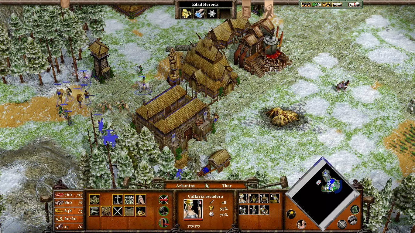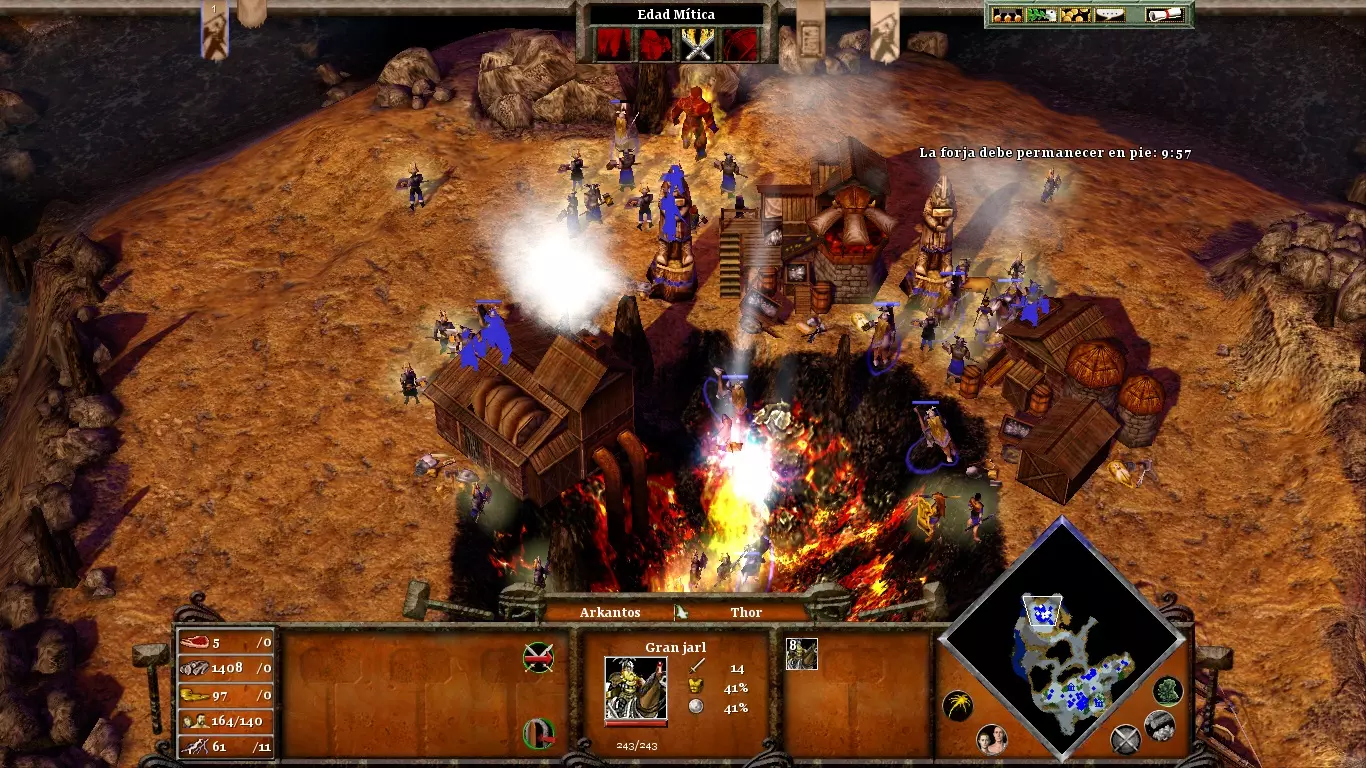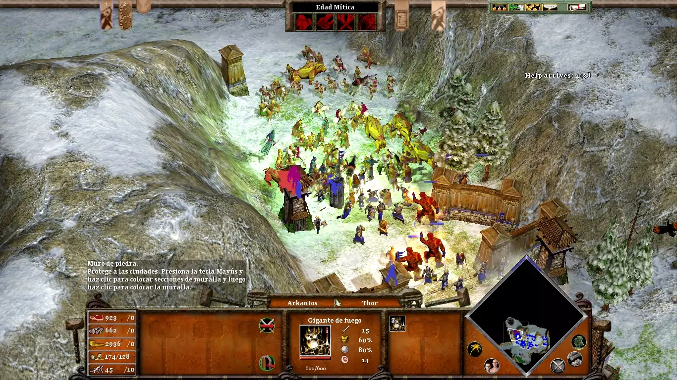 首先,派遣所有村民去采集黄金。只有当你开采完所有黄金(初始矿场和雷神矮人矿场的黄金)后,再派矮人去砍伐树根。伊特里的部队数量相当有限,因此最好让装备锤柄的布罗克前进,而不是相反。两者之间的一个良好会合点已在上方某张图片中标出。派遣你不再使用的单位(例如矮人或掷斧兵)去拦截从大门出现的巨人军队。这样可以牵制他们,为你争取重要时间来组装锤子的各个部件。(内容无法识别,已删除)
