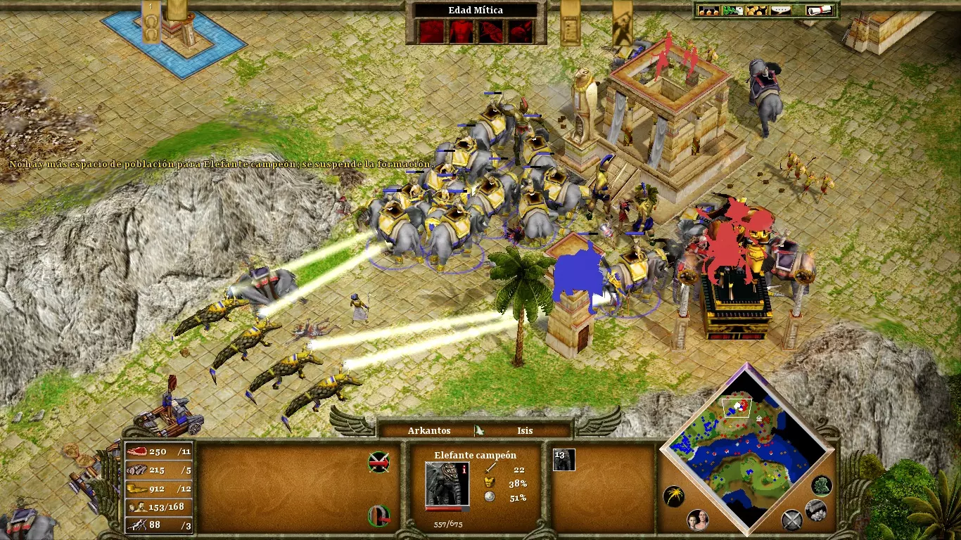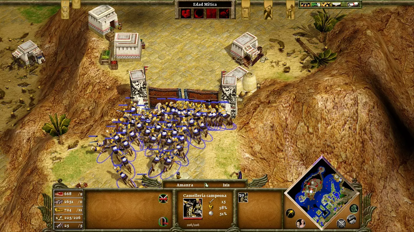 首先,你可以专注于村民的生产,因为敌人的攻击不会立即到来。利用这个机会建立稳固的经济,以便在需要战斗时能够训练米格多尔单位。你的营地目前是分开的,但只是暂时的;如果你砍伐中间的森林,就能整合你的力量。这非常有用,不仅可以从一个村庄向另一个村庄派遣援军,还能利用商队建立贸易路线。优先选择建造战车、骆驼和战象,而非普通兵营单位;若想突破敌方城墙的坚固防御,你需要精英单位。你的对手受到伊西斯的庇护。如果你想在其城墙内释放技能,必须先摧毁他们的纪念碑。