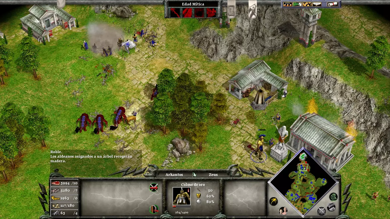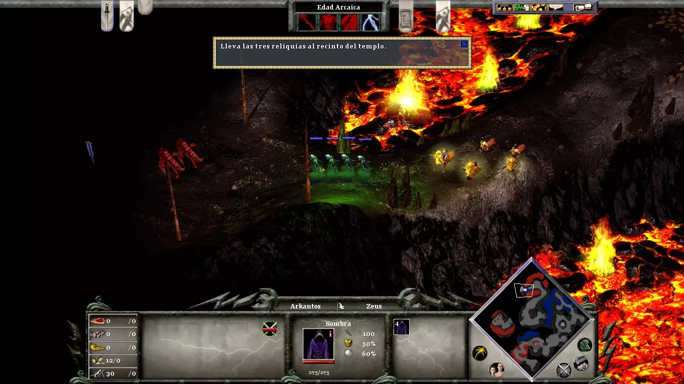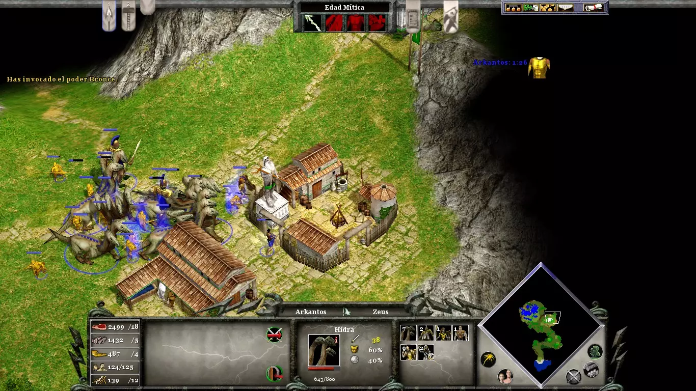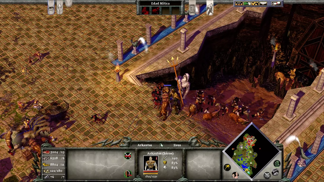 创建的村民必须分配到食物和资源(考虑到独眼巨人的成本)。只需一到两个村民负责木材和黄金。用栅栏封锁村庄南北方向的入口。在村庄附近的悬崖上,你会发现一座敌方塔楼。尽快让阿尔坎托斯摧毁它,因为当你需要寻找资源时,它可能会对你造成干扰。你迟早会受到攻击;准备一些独眼巨人作为防御,并使用未被海蛇击沉的三列桨战船作为防御武器。你可能需要对敌方村庄发动两次攻击(第一次削弱,第二次摧毁)。在首次围攻期间使用【瘟疫】来削弱敌方军事编队。