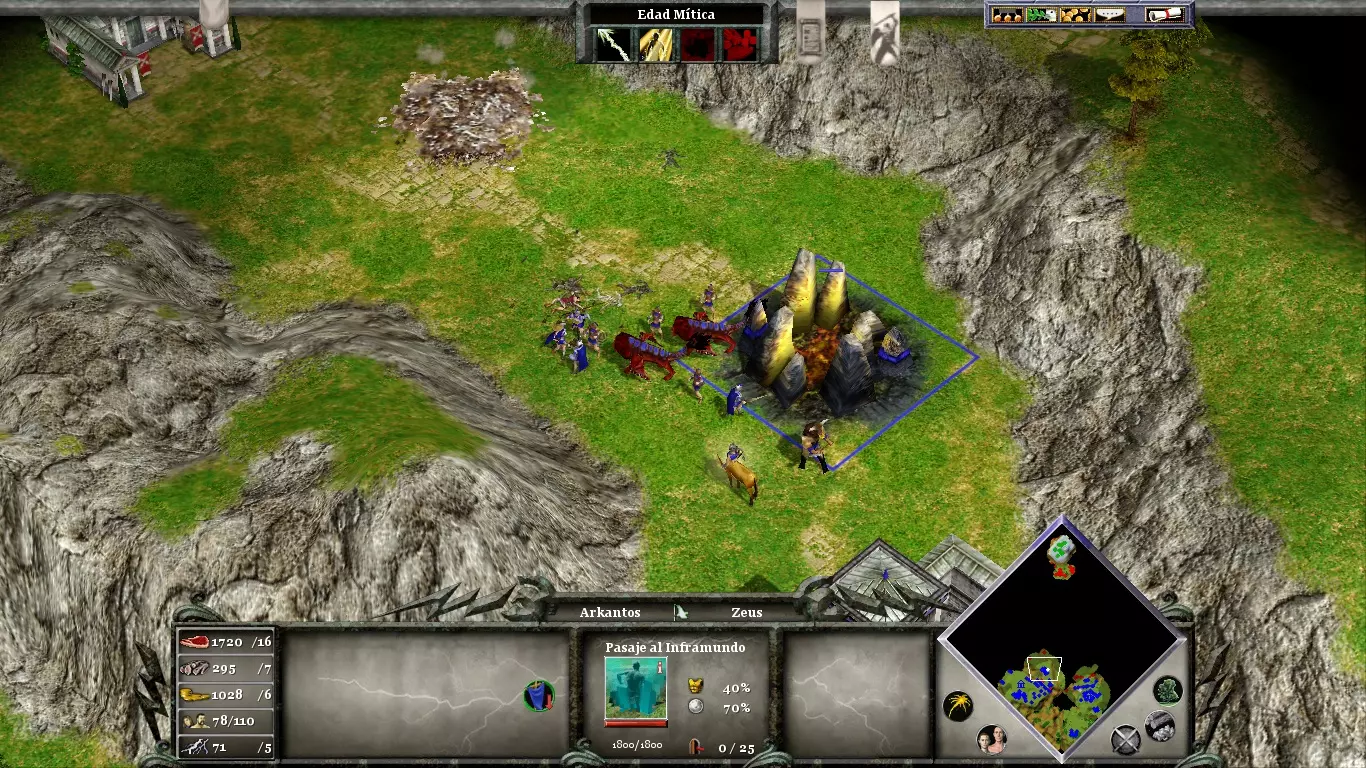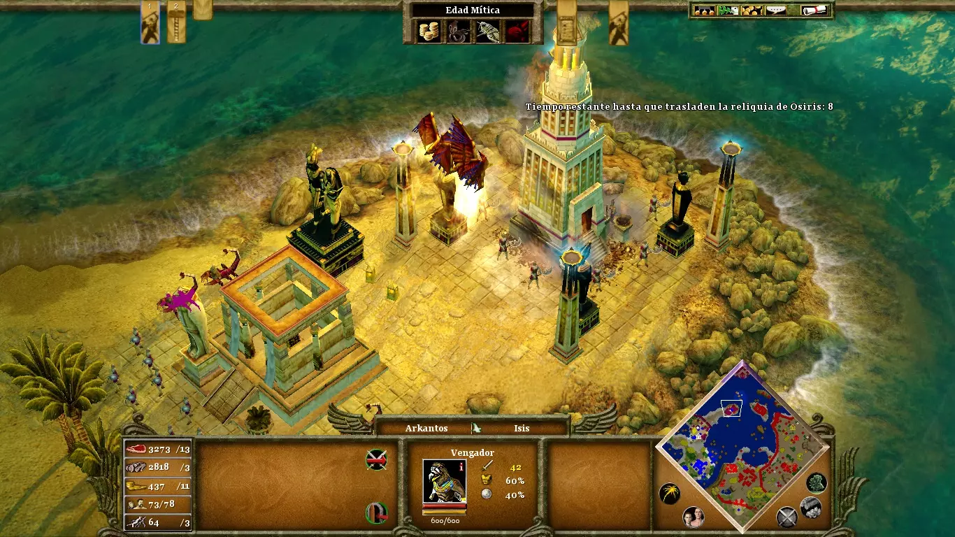 这个阶段最复杂的是抵御初期的攻击(原则上,敌方军队的数量会比你的多得多)。因此,不要犹豫在最初的小规模战斗中使用你的能力来弥补这一劣势。离你的定居点最近的【丰饶宝库】(位于定居点北部)仅由两个巨像守护。你可以通过快速突袭占领它,以帮助你收集建造奇迹所需的资源。创建高生命值的单位(如巨像或九头蛇)或大量人类士兵来牵制敌军,同时让你的【奥西里斯之子】从你部队的后方造成破坏。始终将攻击集中在其神话单位上。