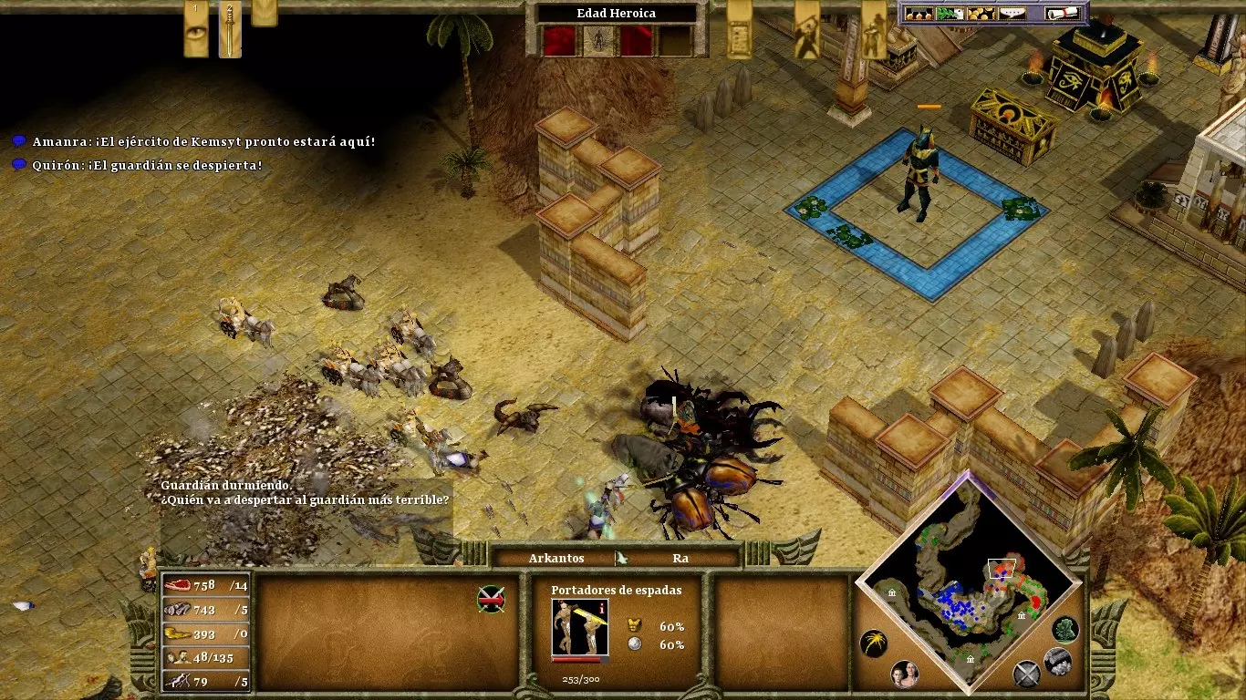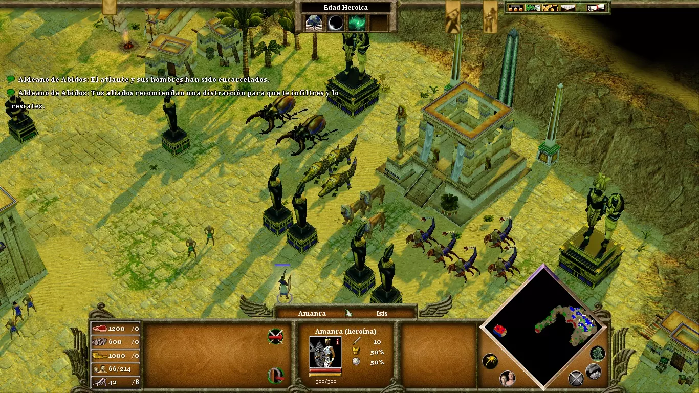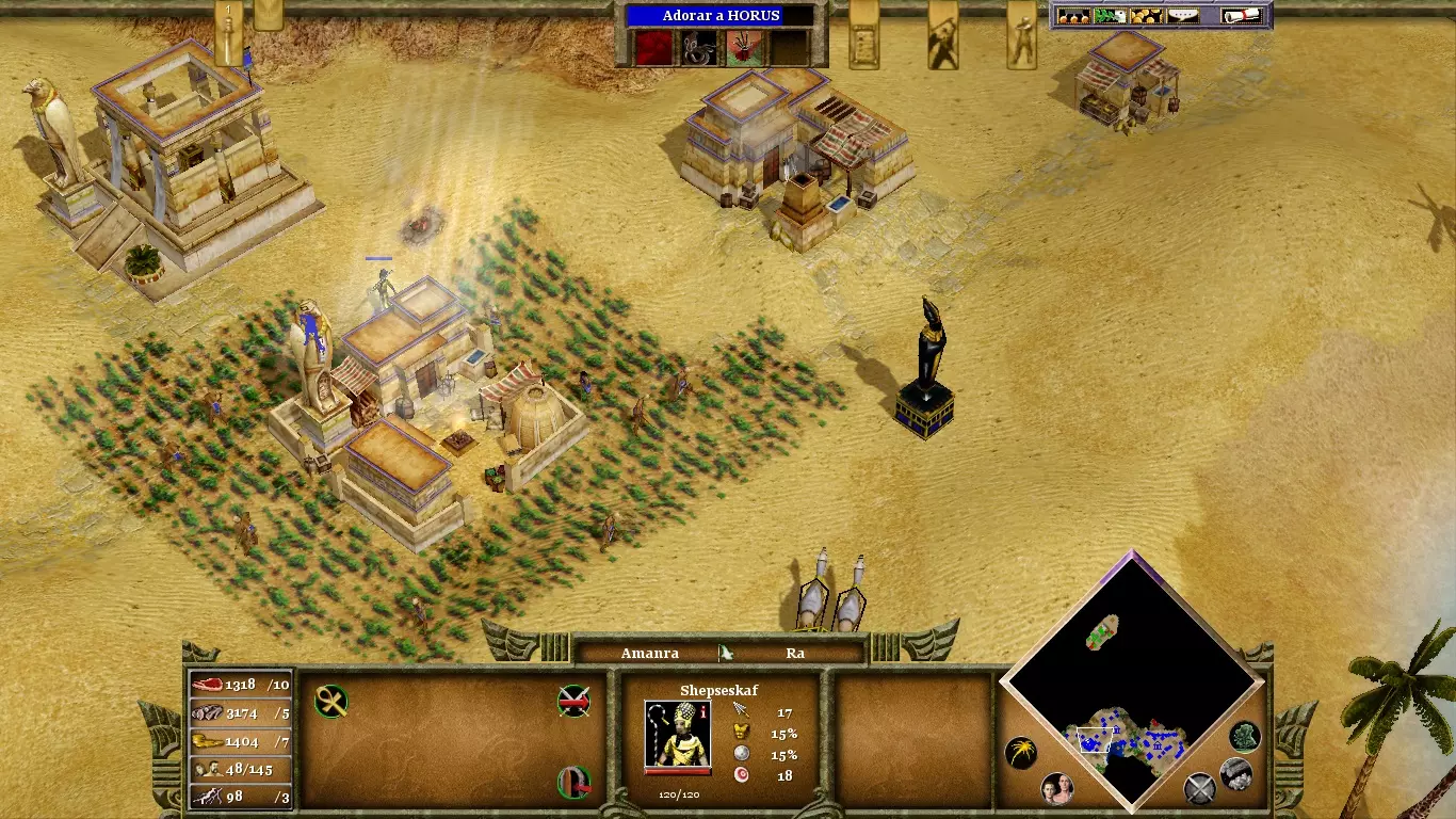 无论你拥有多少纪念碑,当数量达到100个时,就会停止产生恩惠。为避免这种情况,要大量建造村民,并将他们主要分配到食物和黄金生产上。只有拥有繁荣的经济,你才能持续建造斯芬克斯和佩苏克(petsuchos)。用米格多尔堡垒(fortalezas de Migdol)保护通往你村庄的入口,因为敌人的攻击可能来自三个方向中的任何一个。要消灭敌方祭司及其欧西里斯之子,你需要的不仅仅是神话单位。长矛兵和骆驼兵能很好地完成这项任务。在围攻敌方要塞时,或遭受持续攻击需要喘息之机时,可将【视界】与【瘟疫】技能结合使用。达成最终目标时,无需消灭所有监狱守卫,只需将阿曼拉带到监狱中心,牢房便会开启。