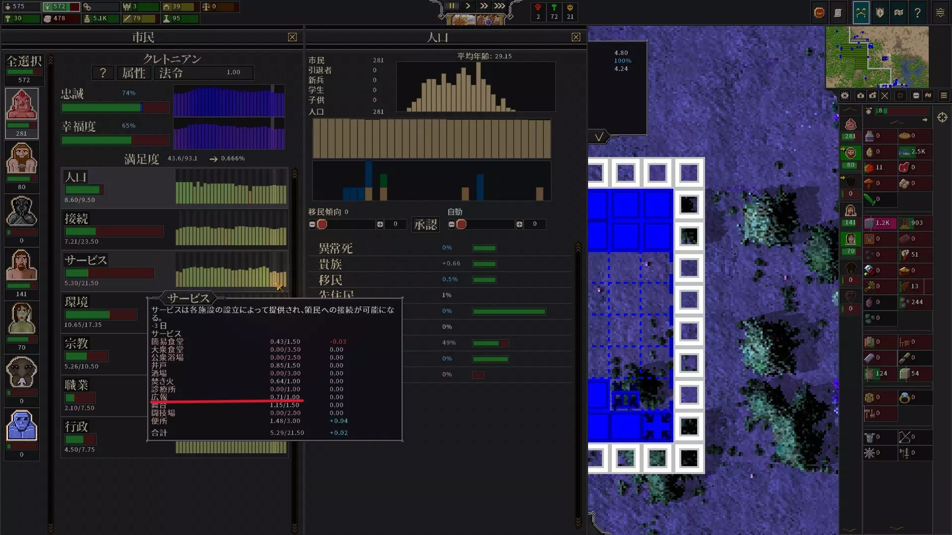 当粮食生产不足时增加人口,会迅速陷入粮食短缺。你可以在图示位置查看当前储存的粮食还能维持多少天,建议在粮食库存稳定且能确保维持数日后,再逐步增加人口。 城市扩张的推进方法: 1. 幸福度提升后,该种族的移民会前来定居。 →若要增加人口,持续维持较高的幸福度即可。 2. 在各种族视图中,将鼠标悬停在左侧表格的项目上,会显示详细分类。 →通过此分类确认数值较低的项目,并建造能够提升该项目的设施。