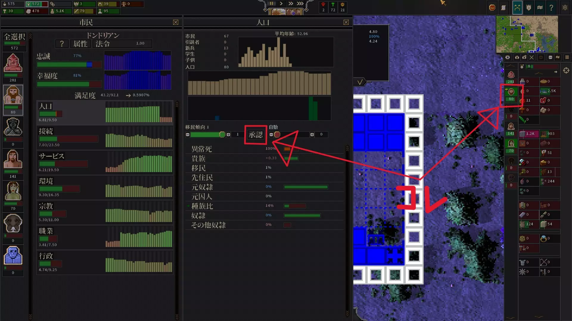 - 当画面右侧种族人数列表的图标带有【→】时,双击该图标可增加希望移民的人数。 - 打开种族视图,通过【人口】>【移民倾向】也可以仅接受一定数量的移民。