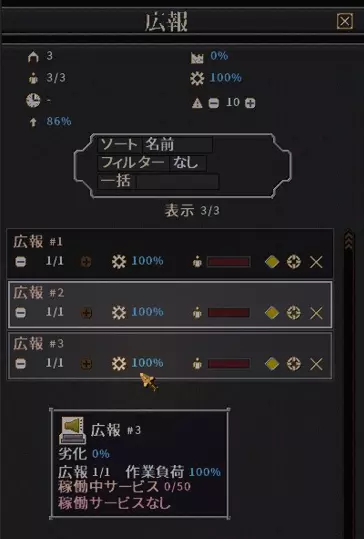 - 查看当前已配置的宣传设施,会发现其负荷达到100%,数量不足以供所有人使用。 - 这种情况下,增加宣传设施就能让全体市民都能使用宣传服务,从而提升幸福度。 基本流程就是这样:【确认幸福度】→【增加不足的设施】。 粮食不足和居住地不足从根本上来说也是同样的道理,只要存在不足,就进行增建吧。 种族专属设施适配性