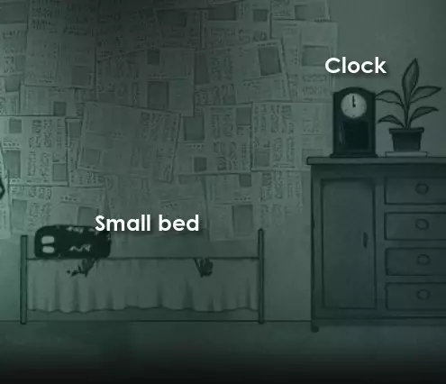 现在向左返回,再次与缝纫机互动以获取指纹1。向右退出到门厅。 我们只是路过,所以在门厅使用右侧的门进入走廊。 你会记得这条走廊有两间卧室,先进入最近的那一间。 在这里,你可以检查小床获取一些信息,然后检查时钟获取指纹2。