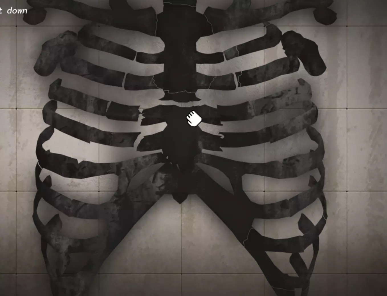 当你重新获得控制权后,向右走,边走边查看路标,直到进入新场景,然后进入右侧最后一扇门。 解剖室里唯一值得注意的是一排照片,检查它们可以获取一些额外信息,之后进入右侧的门。 在停尸房里向右走,检查有灯光照射的尸体,按照提示操作,会触发一些对话。 接下来是一个拼接骨头的小游戏,如果你需要帮助,以下是拼接完成后的样子。