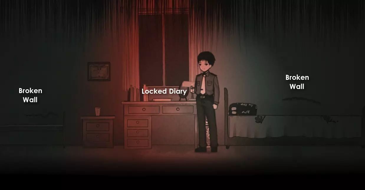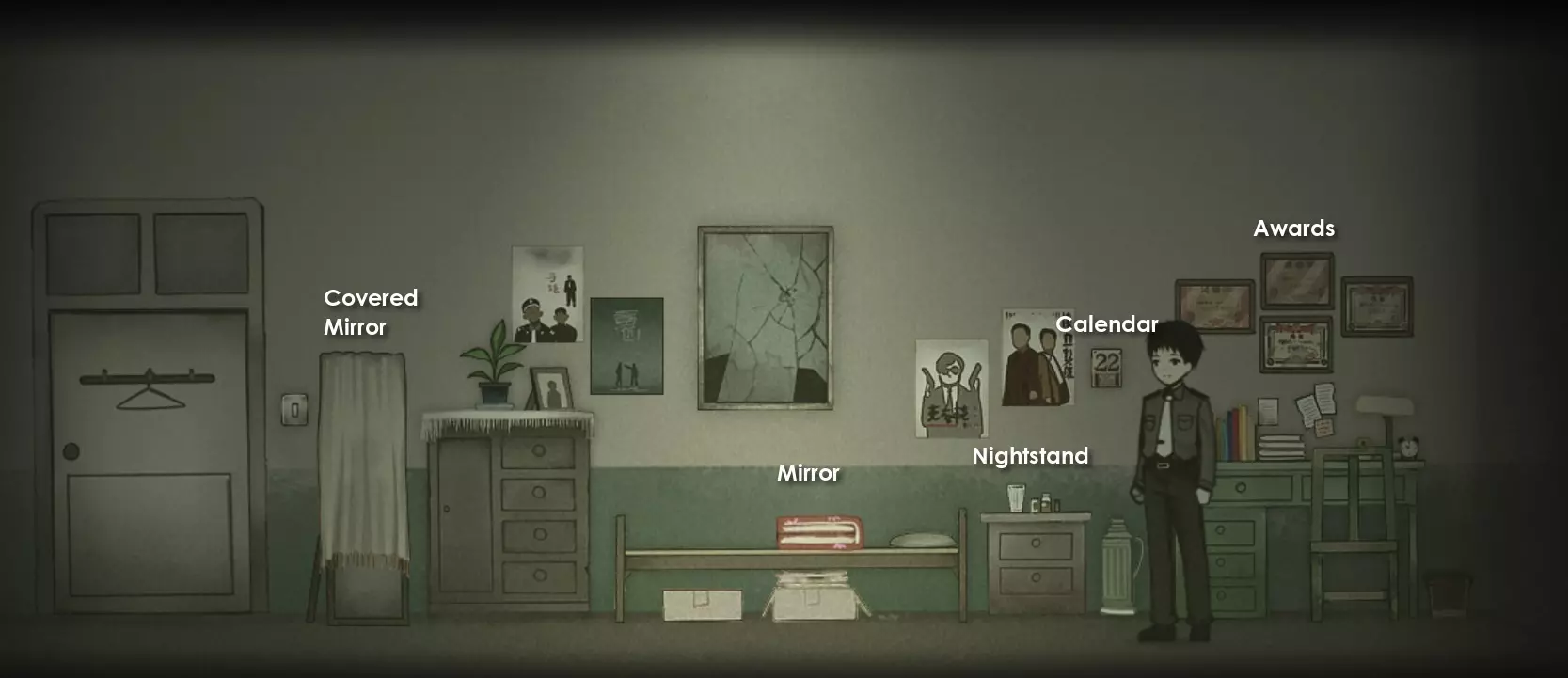 与床右侧的床头柜互动,然后经过镜子后折返,与从镜子上掉落的物品互动,获得镜子碎片1。 向左移动,与被遮盖的镜子互动,移开布获得镜子碎片2。 现在向右走,与日历互动以获得一些诡异氛围,然后再向右走,与奖杯互动获得镜子碎片3。 前往镜子处将其修复,然后专注于镜中的影像以切换场景。 离开浴室,在办公室角落房间拿起点燃的蜡烛,向右走出门到外面。 走上右侧的楼梯并打开门。 在这里检查右侧的日历、左侧的红色雨伞,然后从左侧用警戒线围起来的门离开。 你将进入客厅。