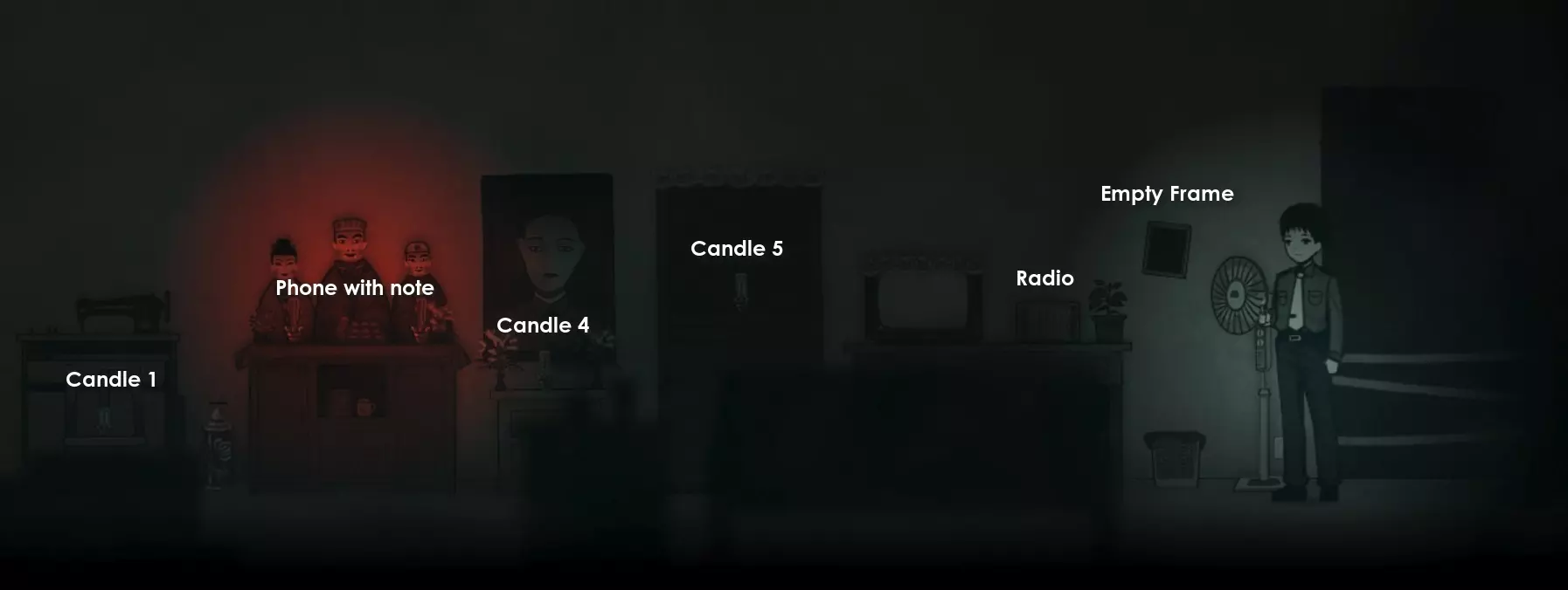 查看你左侧的空相框,然后查看桌上那部亮着红灯的电话,获取黄色纸片【Huisha】。 现在按顺序点燃蜡烛,注意2号和3号蜡烛已经点燃。完成后,与电视附近的收音机互动。 你需要正确调谐收音机。说实话,这个谜题有点隐晦。 如果你需要提示,观察带编号的蜡烛所处的高度位置。 实际解决方案:从左到右,第一个旋钮调至最低位置,第二和第三个旋钮调至从顶部数第二个位置,第四个旋钮调至从顶部数第三个位置,第五个旋钮调至顶部位置。 完成后,进入缝纫机左侧、1号蜡烛所在位置的门。你会来到厨房并进行一段简短对话。 打开门边的橱柜,检查酒坛,然后向右走向 stove,拿起筷子。返回橱柜的途中查看桌上的诗,接着用筷子从酒坛中夹出全家福。 回到客厅。 在这里向右走,与空相框互动,将其摆正后获得密码。电视部分会明确提示你需要做什么。 与电视互动,调至正确频道【21】。 你会看到一些数字,然后清洁屏幕触发一段场景和开门的声音。 通过右侧的门回到门厅,然后再次使用右侧的门(挂着珠帘的那扇)。在这个走廊里,进入红灯笼下方的门。你会来到一间卧室。
