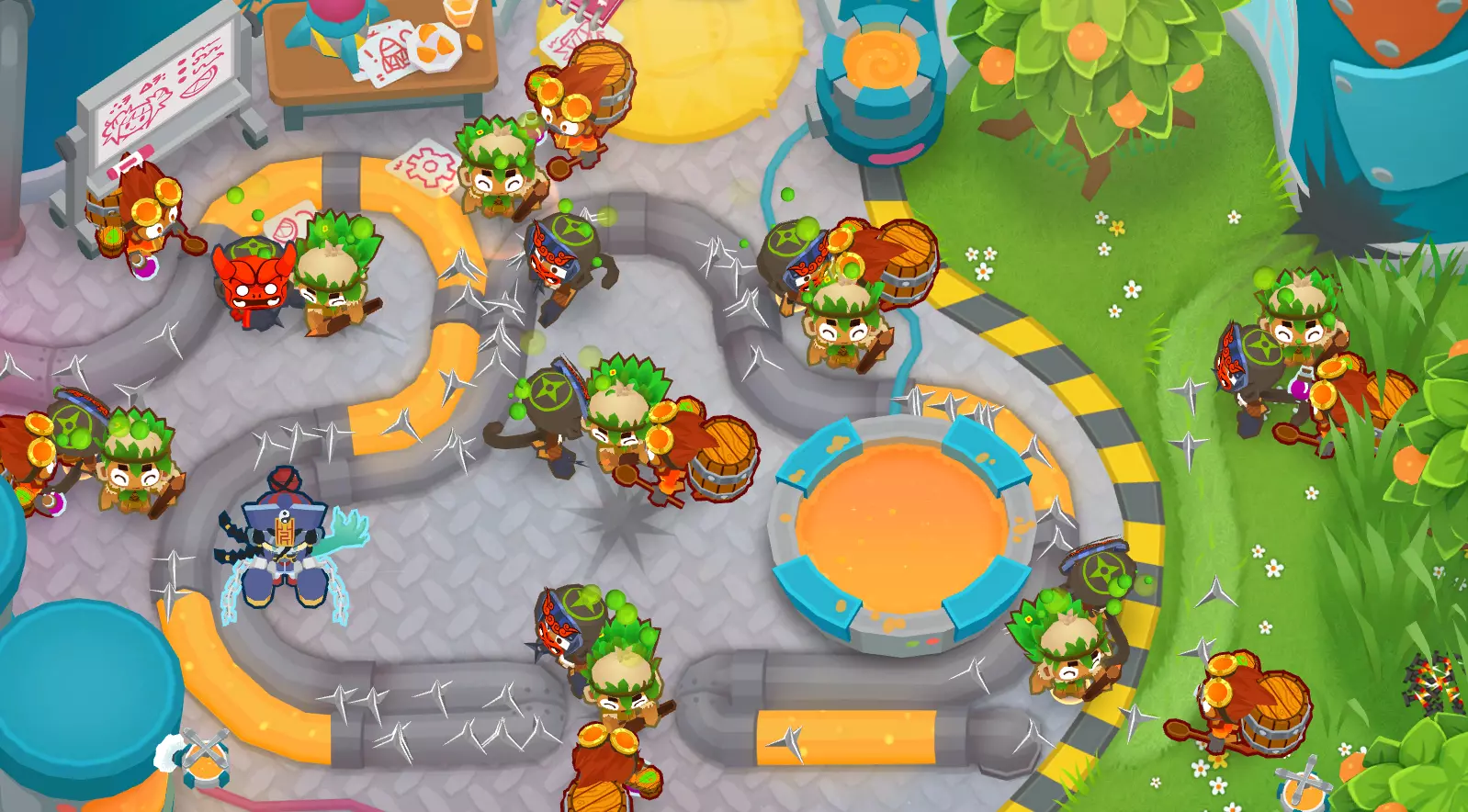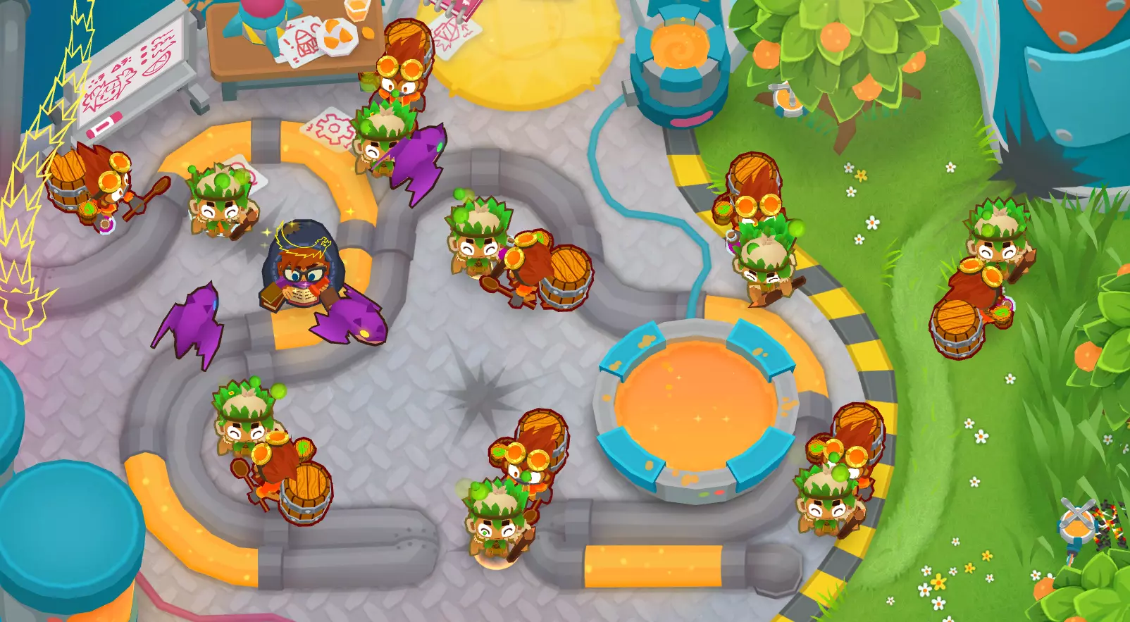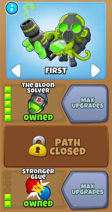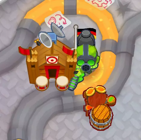 这就是所有黄金气球的噩梦——【5-0-2胶水炮手】。 他自身就很强大。但还有更强的组合! 用【4-2-0猴子村】和【3/4-2-0炼金术士】为他提供增益。 同时,将胶水炮手放置在更靠近地图起点的位置,确保他能轻松获得两次攻击黄金气球的机会。 示例