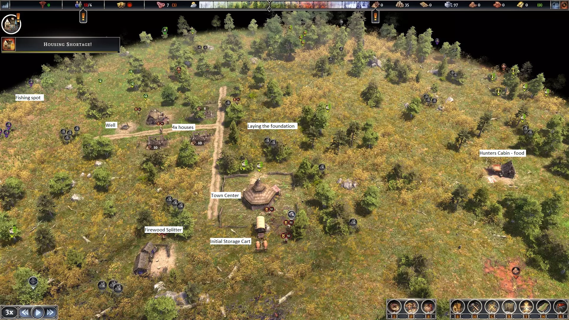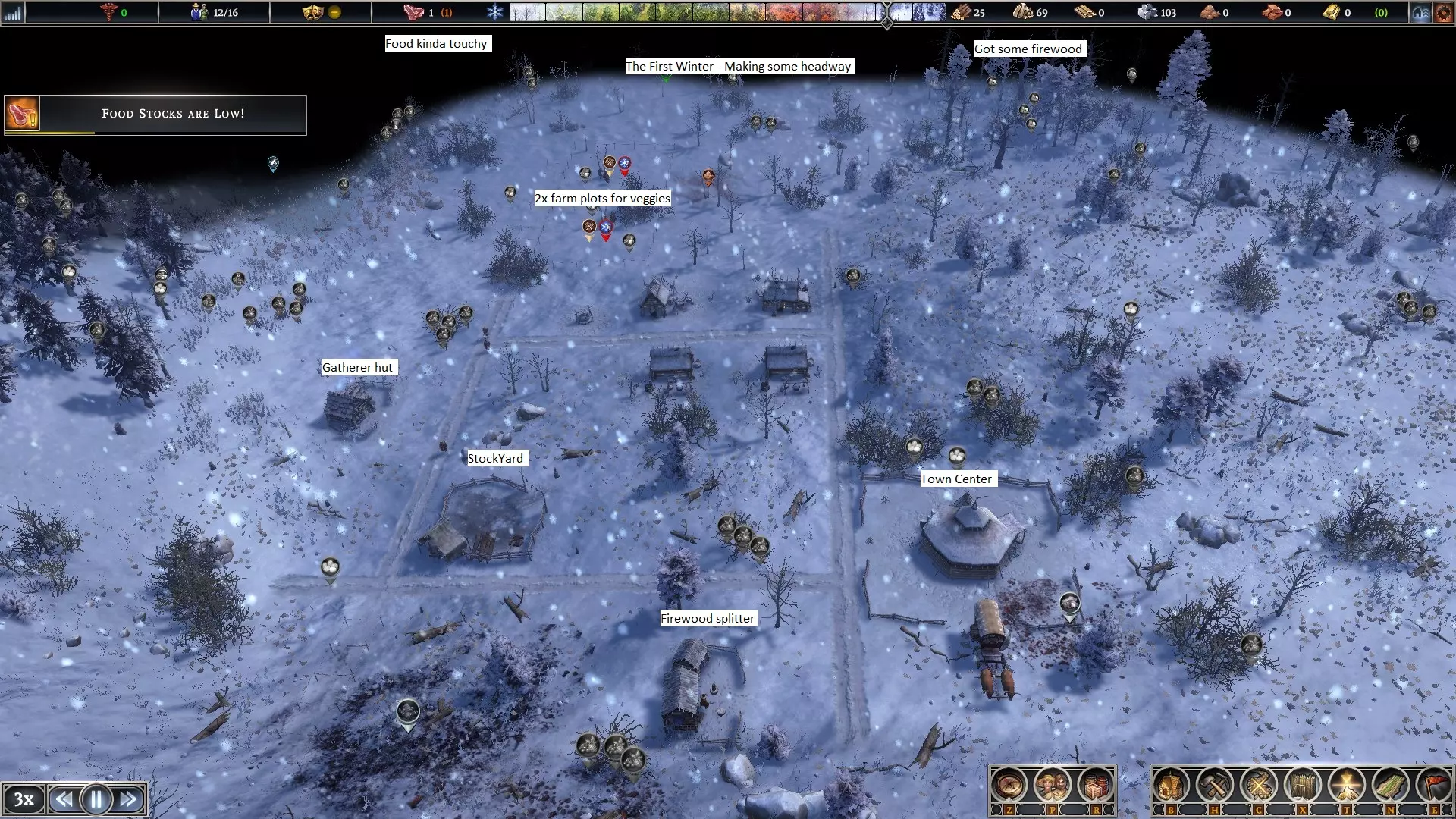 在规划城镇布局时,不要把所有建筑都紧挨着放置。你需要把建筑物间隔开来,因为随着我们研究或解锁新内容,会获得新的建筑——所以要提前规划。 城镇里有【水源】,正在建造4间【房屋】,还有用于获取食物的【猎人小屋】。这三样都是必备的。同时也预留了建造渔夫小屋的位置。我们需要在短时间内获取足够的食物来度过冬天。还需要建造一间【采集者小屋】,它能提供多种食物,而居民的幸福感在后期也需要这些多样化的食物。 当第一场雪开始落下时,让我们审视一下城镇,看看在这一年里我们取得了多大的进展。我们增加了一些储物空间、2块农田和1间采集者小屋。食物方面有些棘手,居民家中的存粮本应足够过冬,但城镇的粮食储备却极度匮乏。