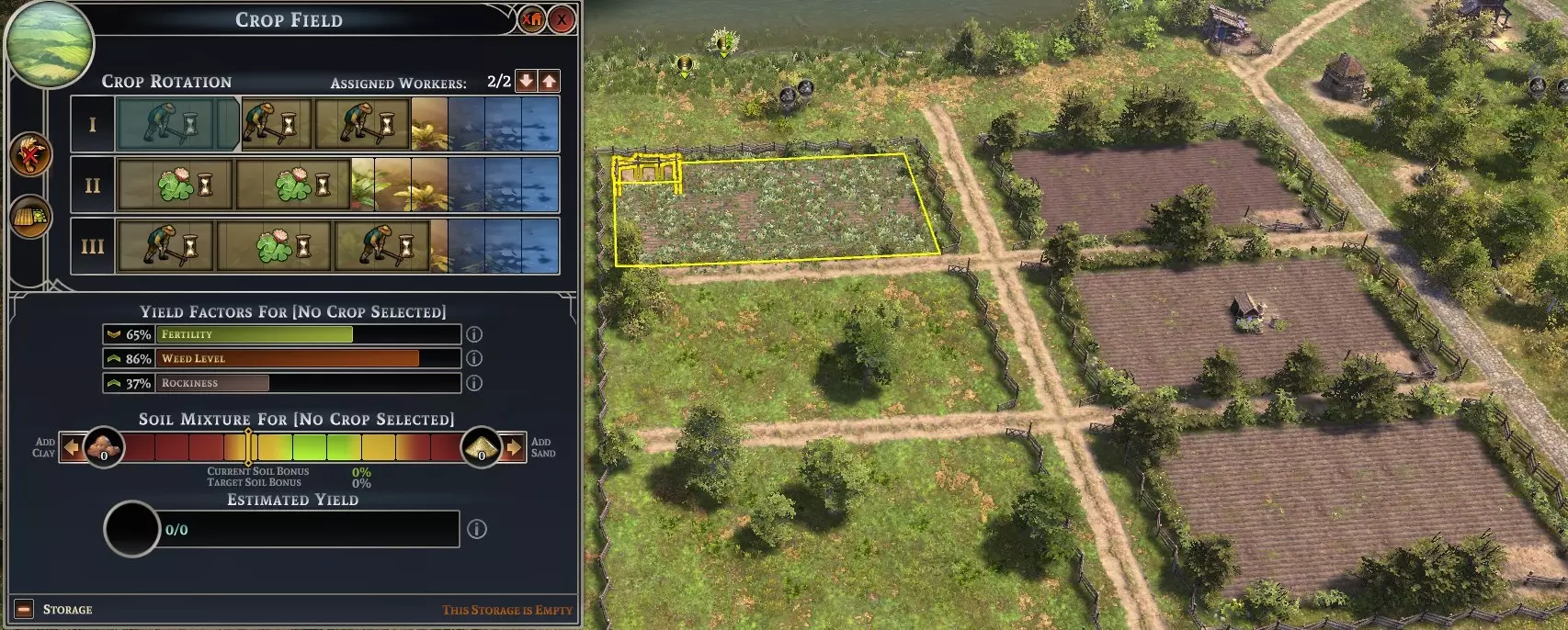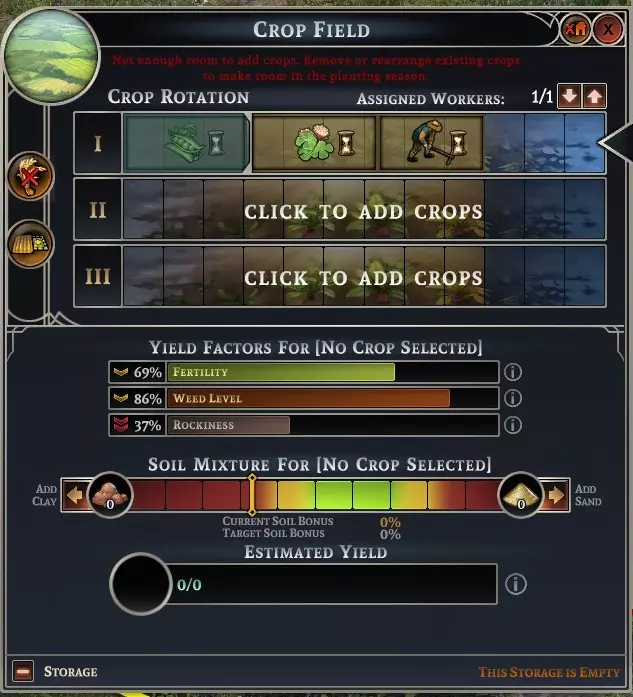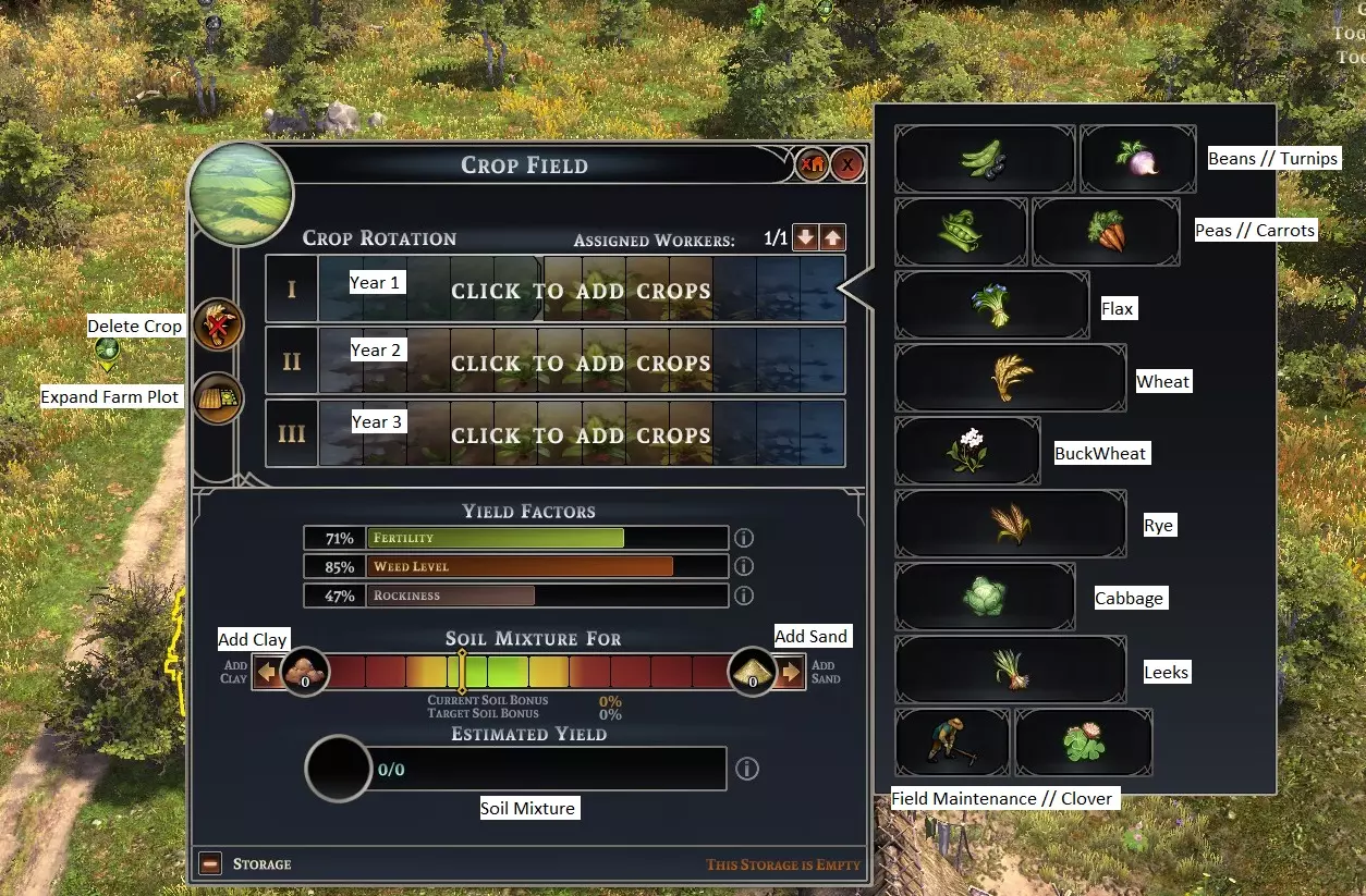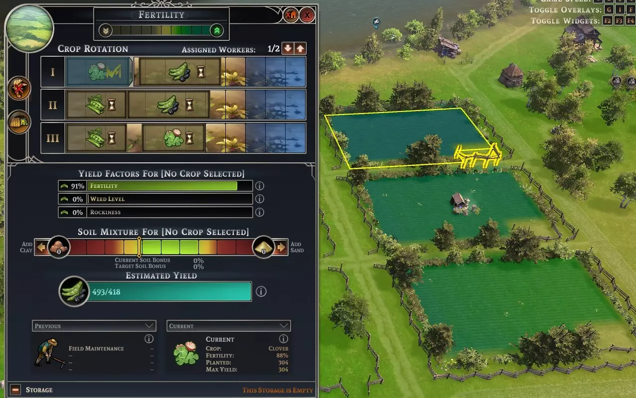 看到那些杂草和石头了吗?使用【耕地】维护选项可以降低这两项负面指标。如果你的猎人、渔民和采集小屋能提供足够的食物产出,我建议在最初的两三年种植三叶草并进行耕地,这样能大幅减少杂草和石头,从而提高产量。
