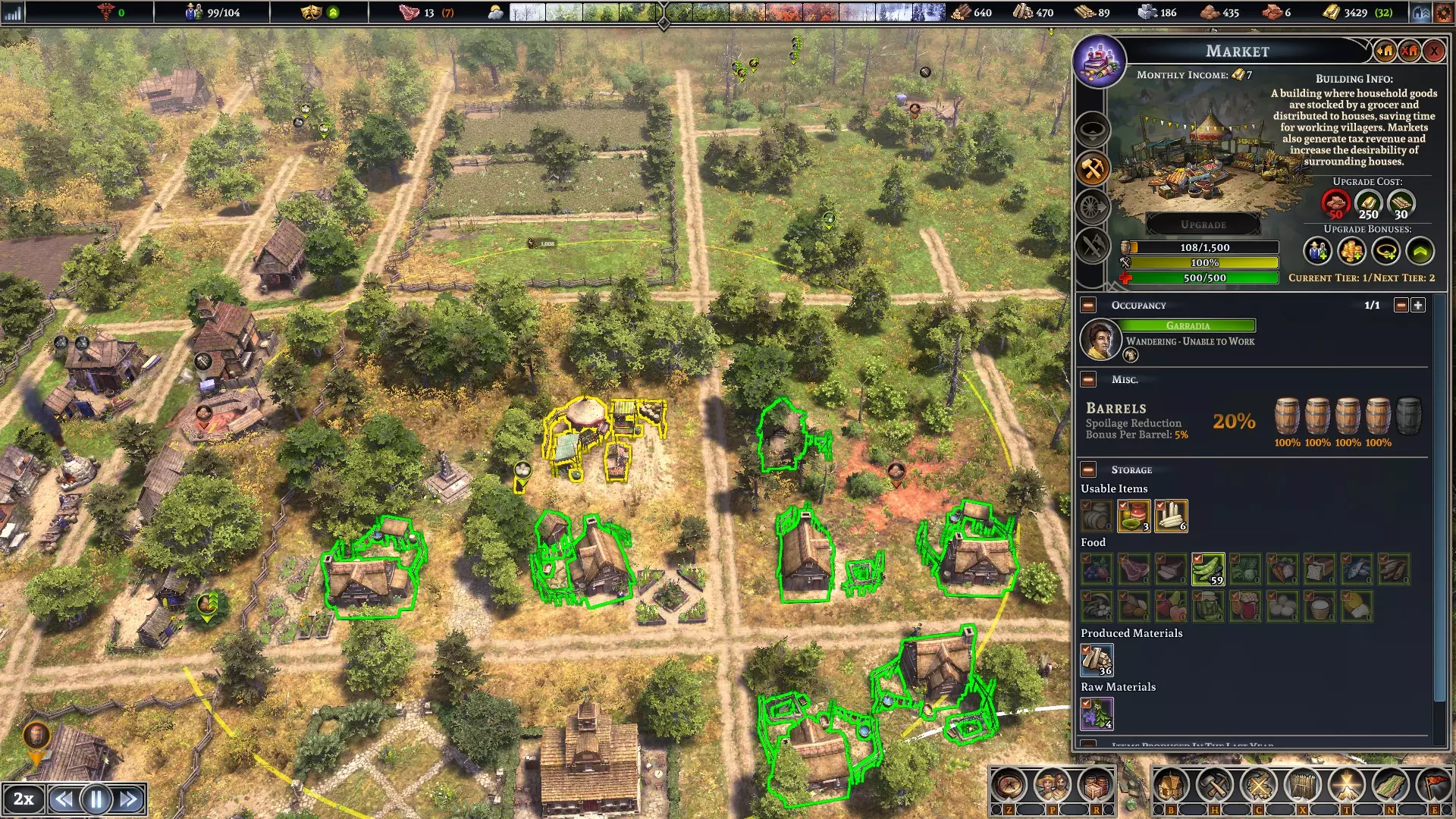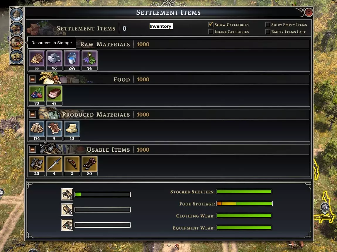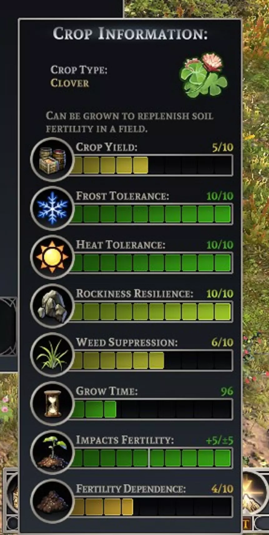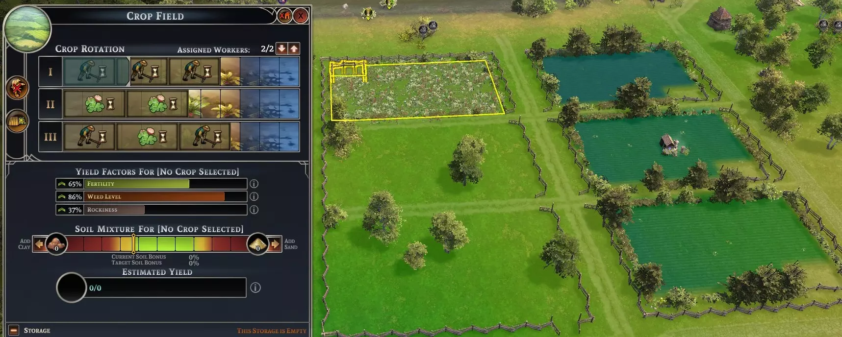 看到那些杂草和石头了吗?使用【耕地】维护选项可以降低这两项负面指标。如果你的猎人、渔民和采集小屋能提供足够的食物产出,我建议在最初的两三年种植三叶草并进行耕地,这样能大幅减少杂草和石头,从而提高产量。