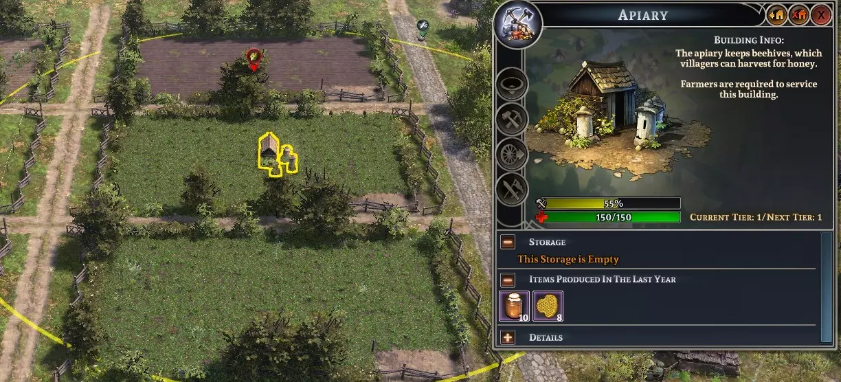 耕种和种植三叶草两年后,我在第二年种了春豌豆,之后又种回三叶草。现在我们可以放心地从计划中取消耕种操作,在那里种上粮食。但要注意,不要在几年内毁掉所有的成果。每年种一次三叶草,每年种一次农作物。这样你就能获得稳定的高产。 查看农作物信息界面,注意另一个名为【杂草抑制】的指标。有些农作物能有效阻止杂草生长,而另一些则会让杂草快速蔓延。这完全是一种平衡的艺术。 1. 建造3块田地,尺寸可以是5x5、6x6或10x10。游戏初期小田地效果最好,到了后期建造更大的田地也没问题。注意,疾病要求你在田地上轮作不同类型的作物,这样才能防止疾病失控并毁坏田地。如果作物类型相同,疾病可能会从一块田地蔓延到另一块。每年都要轮作作物类型。 还有一个机制需要注意——蜂房。将蜂房放置在田地中央,由照料蜂箱的农民负责管理。蜂房产出的蜂蜜不算作食物,但你可以在市场上出售蜂蜜来促进贸易。蜂蜡可用于为城镇制作蜡烛,多余的蜂蜡也可以卖给商人。