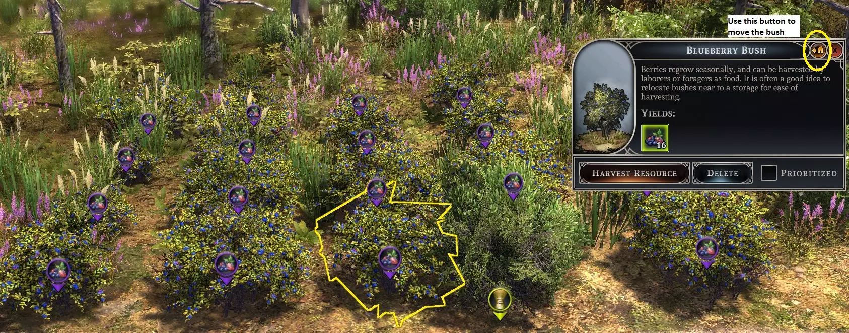 房屋的小范围区域很可能与市场不重叠,因此该房屋无法获得市场服务。 而上方的房屋恰好位于市场的覆盖范围内,所以该房屋可以获得市场服务。 只要服务建筑的覆盖范围与房屋重叠,无论房屋的范围是否与服务建筑重叠,该房屋都能获得服务。 部分物品具有特殊性,拥有额外的可用操作。 例如,这株蓝莓灌木可以被移动并重新种植到其他位置。
